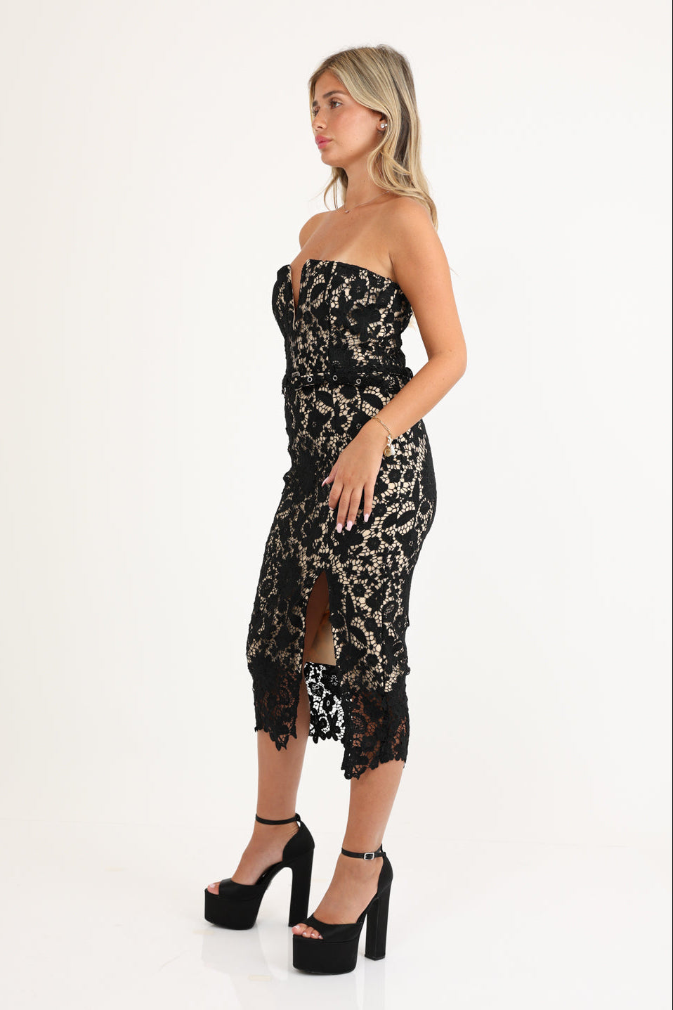 فستان كوكتيل بدون حمالات، بياقة جذابة وفتحة أمامية أنيقة