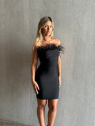 فستان ميدي بدون حمالات مزين بخط من الريش عند الصدر مصنوع من قماش مشدّ الجسم