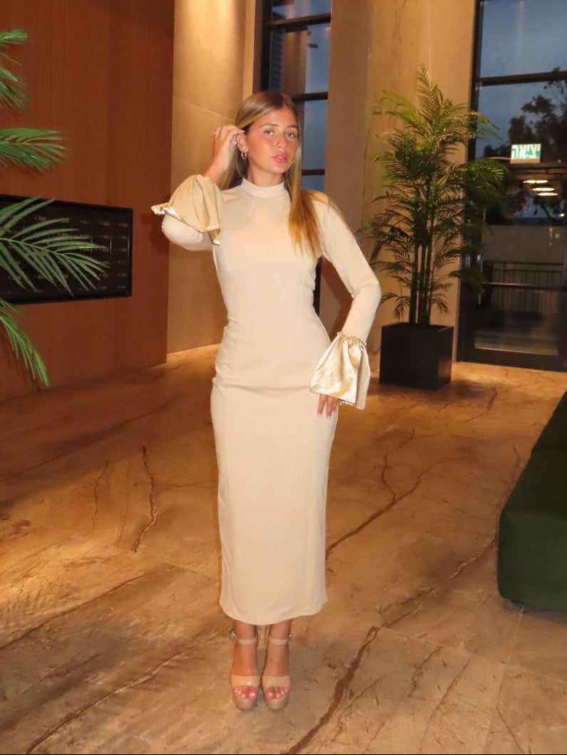 فستان طويل ضيق بياقة عالية وأكمام طويلة. أطراف الأكمام واسعة مصنوعة من قماش الساتان اللامع الذي يمنحه مظهراً فاخراً وأنيقاً.