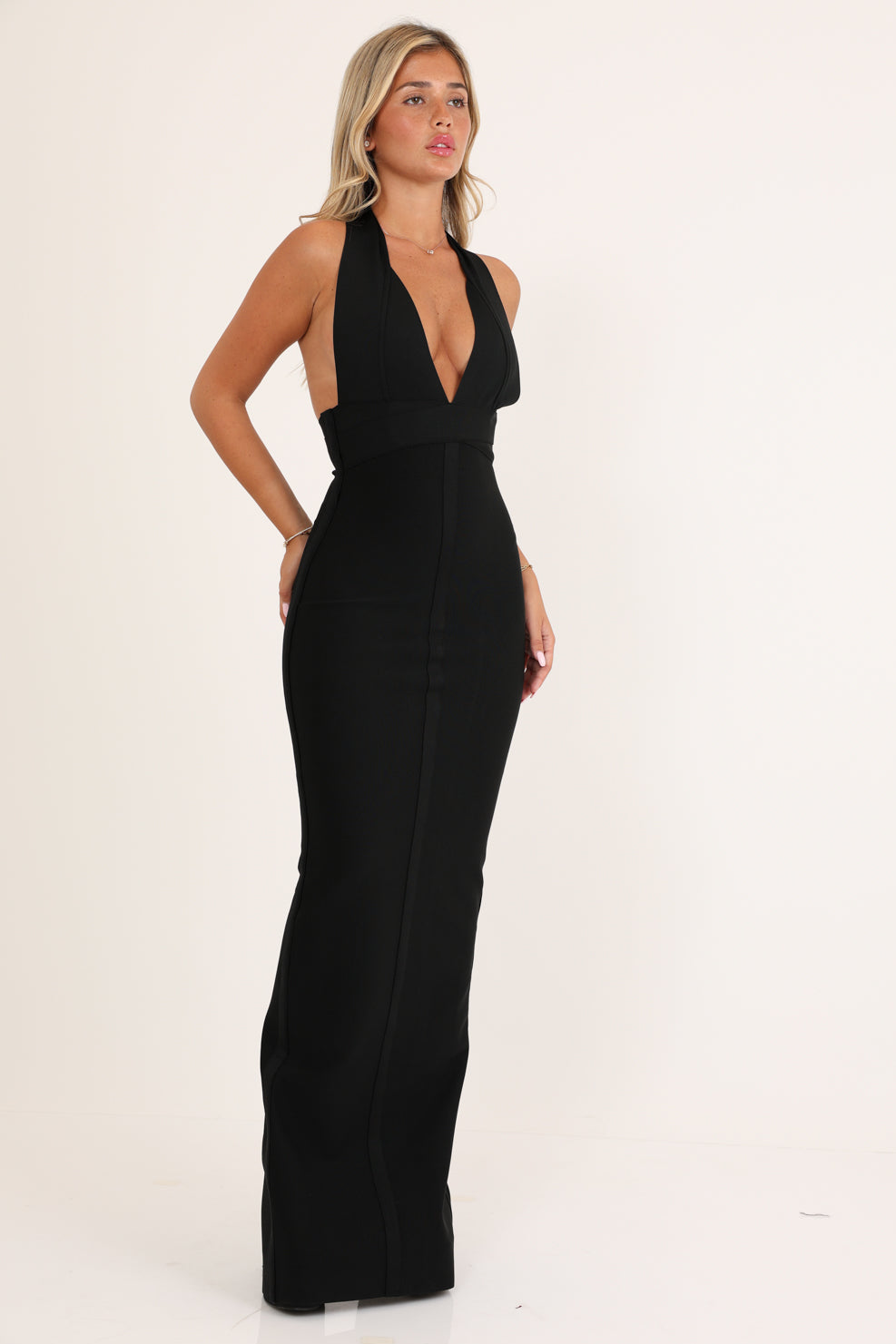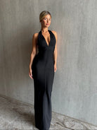 فستان سهرة كلاسيكي بفتحة رقبة عميقة مصنوع من قماش مشدّ الجسم