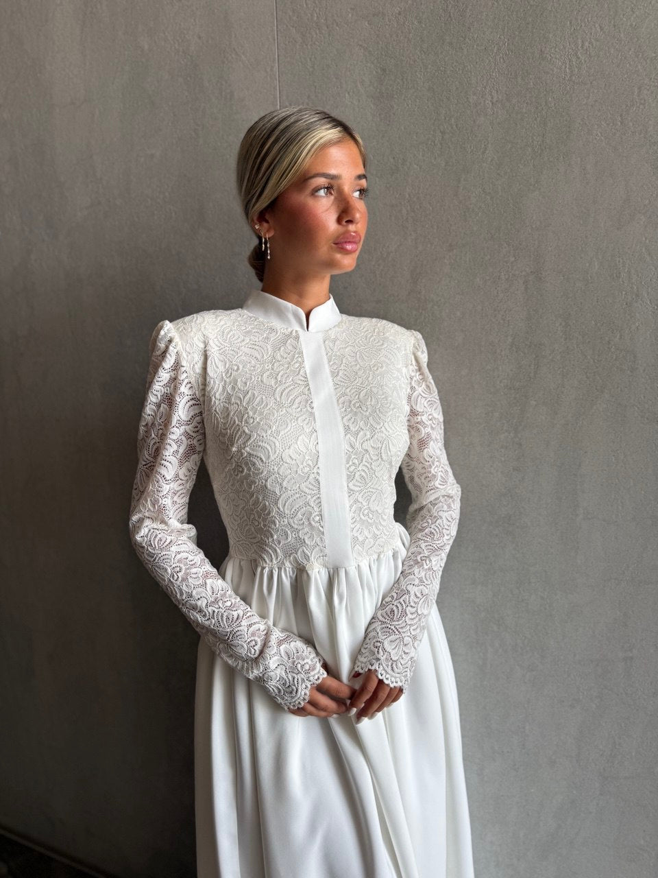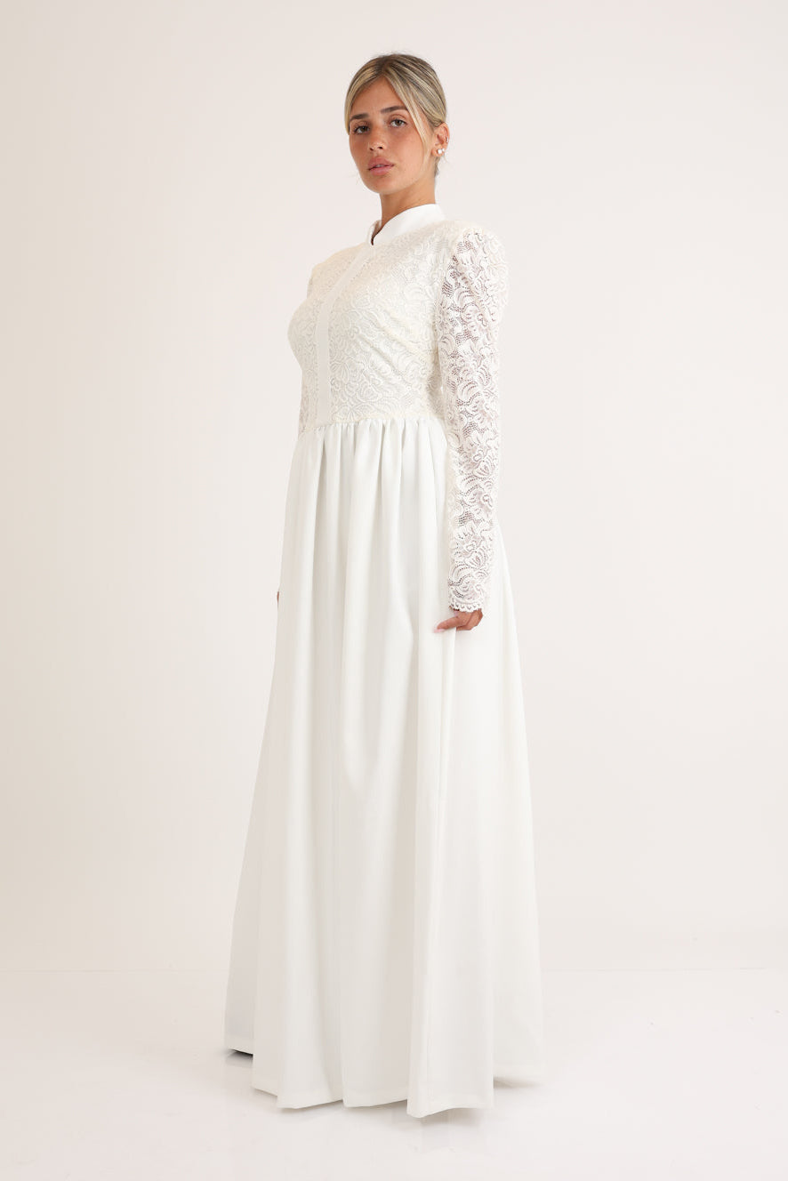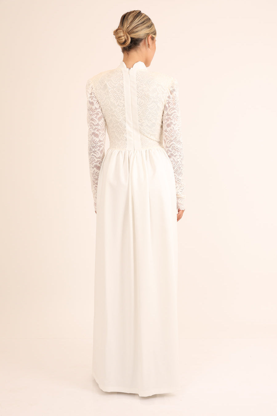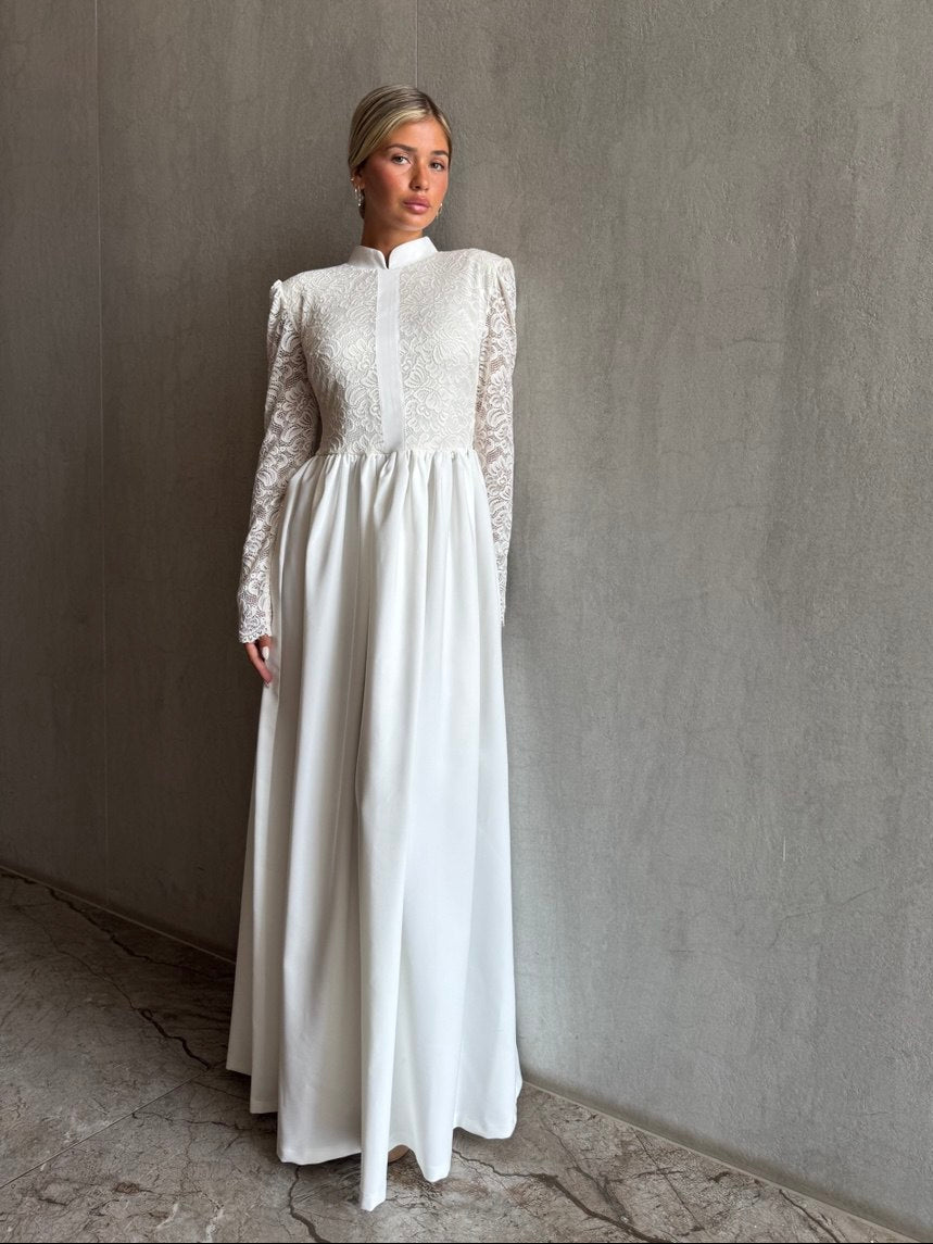 فستان طويل مزين بالدانتيل في الجزء العلوي، وياقة صينية، وسحاب للإغلاق في الخلف