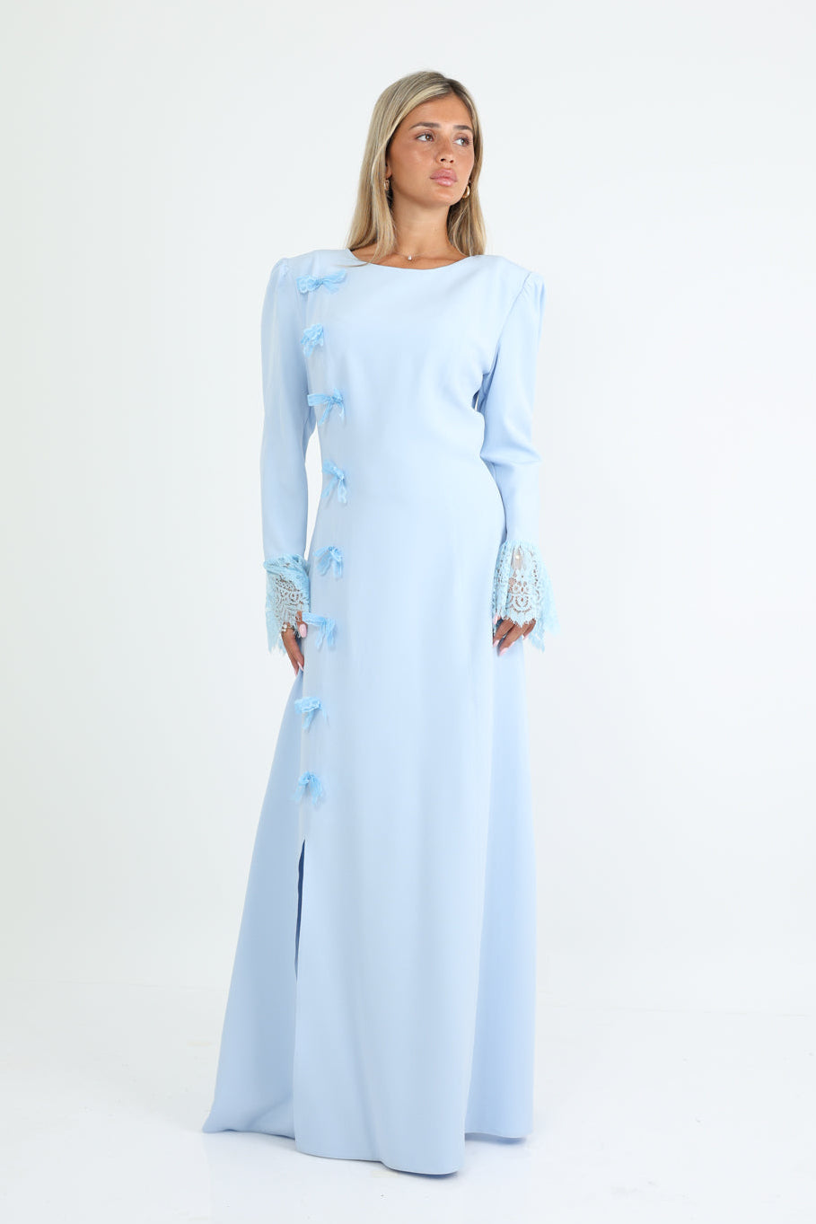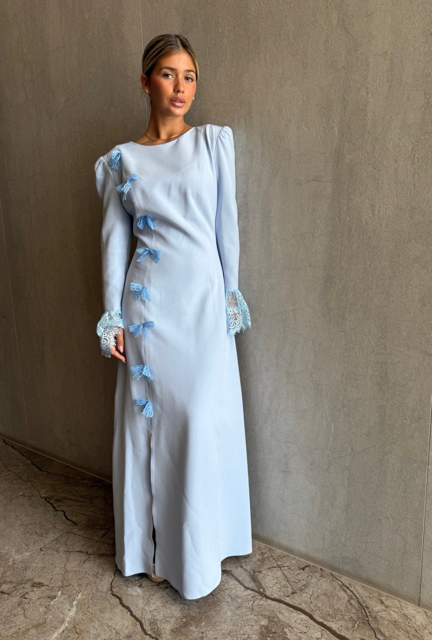 فستان طويل مزين بفيونكات، وأكمام من الدانتيل، وفتحة صغيرة