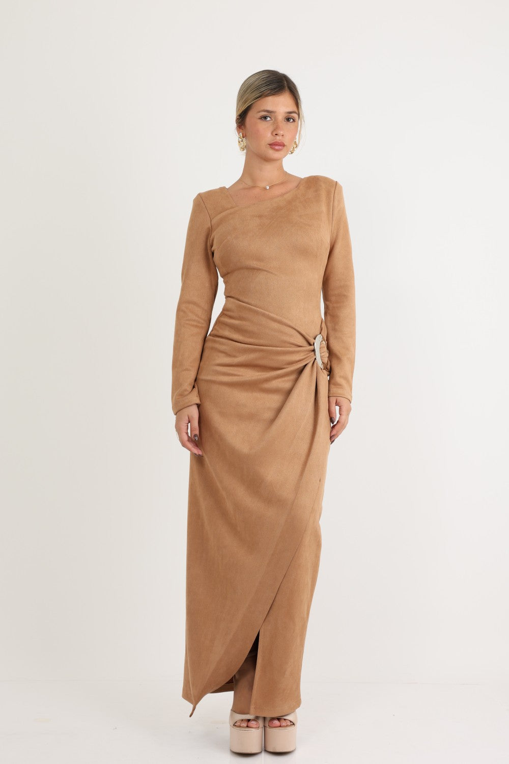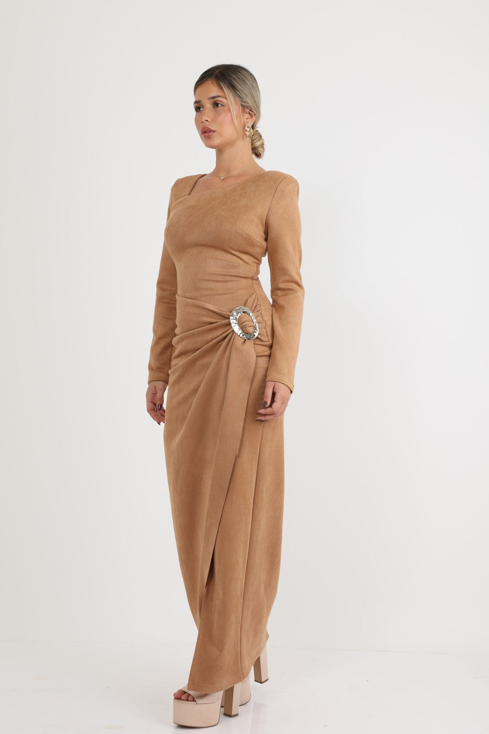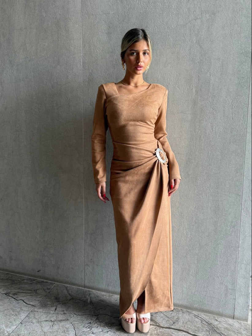فستان طويل مزين بثنيات وإبزيم فاخر