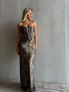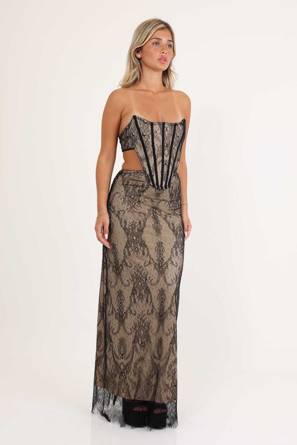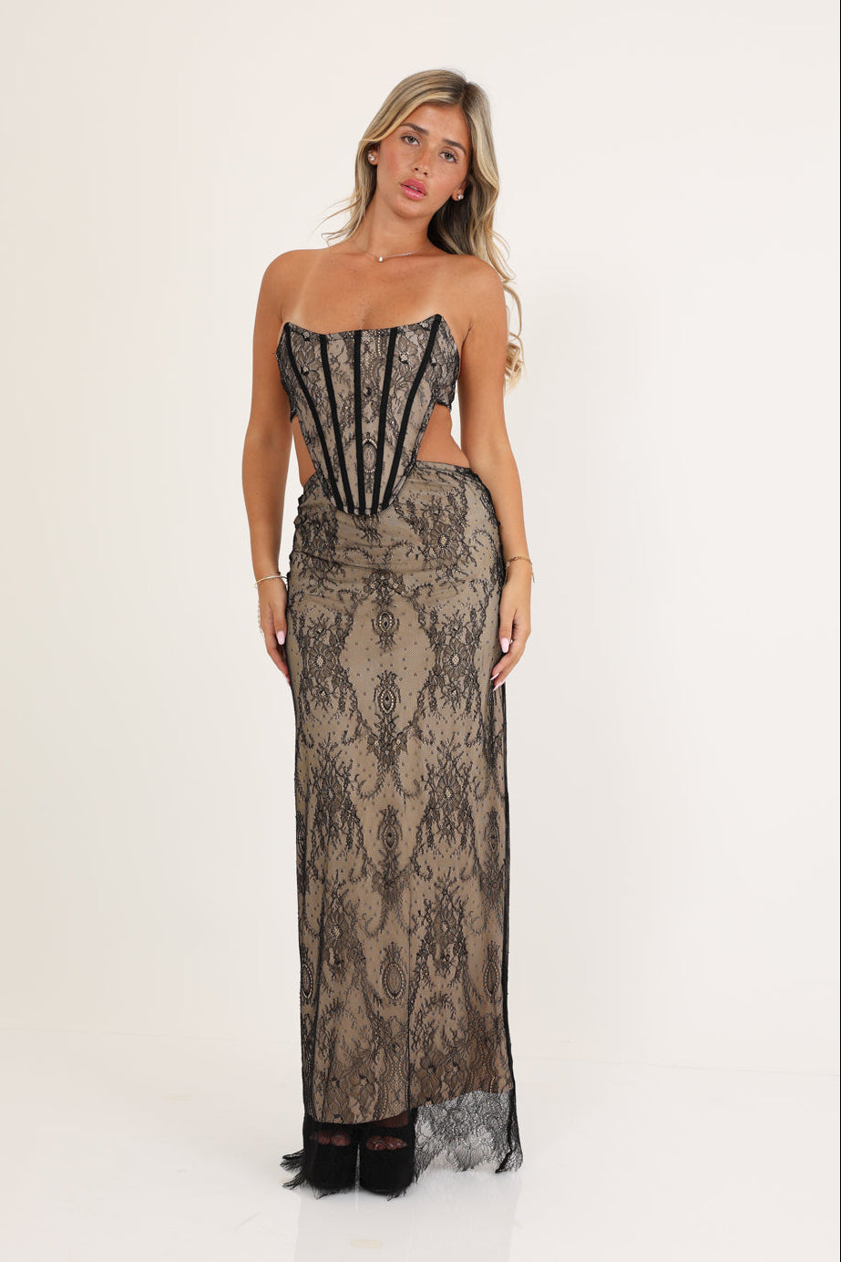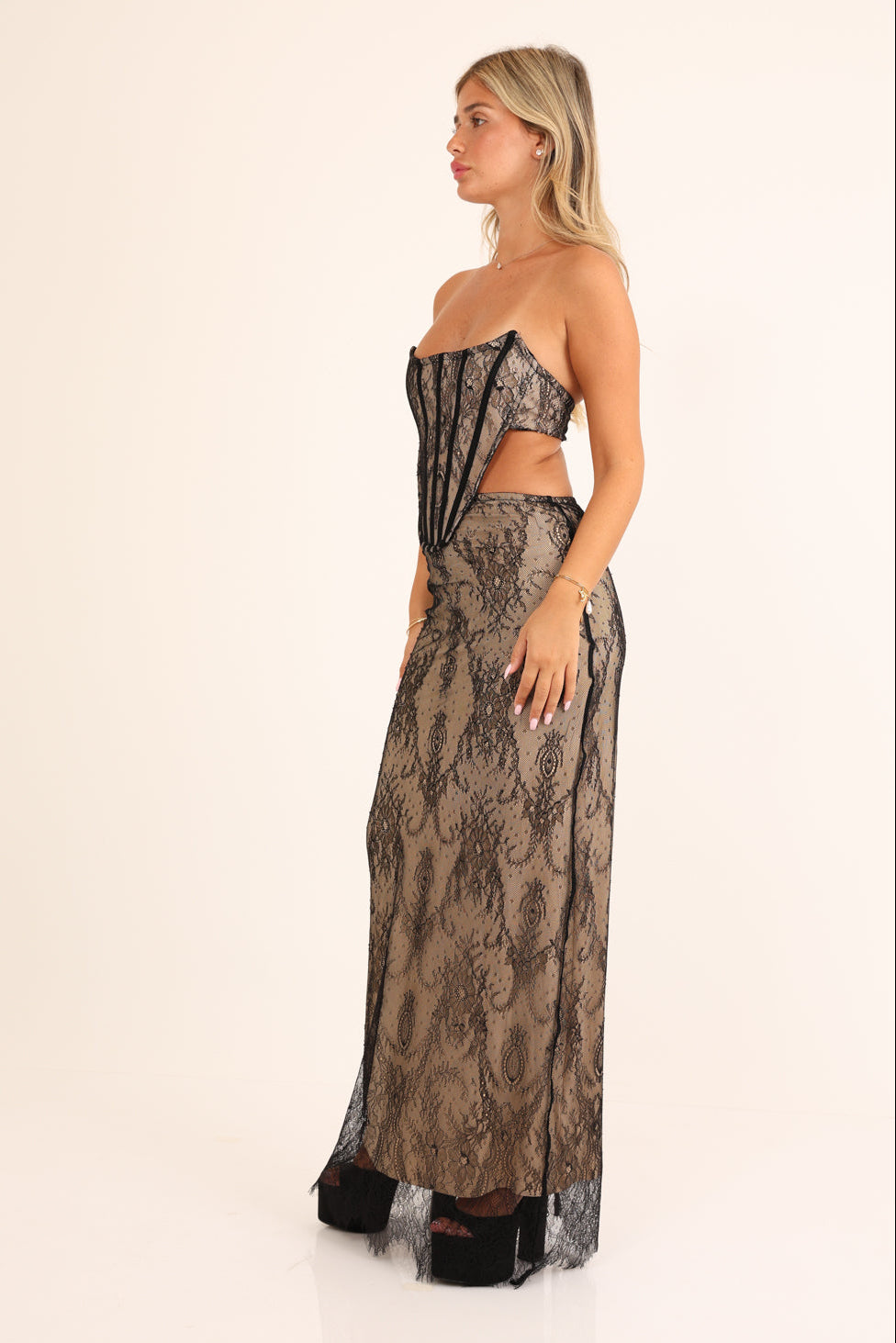 فستان سهرة طويل بدون حمالات، صدرية مدعمة بعظام، ومزين بالدانتيل مع فتحات.