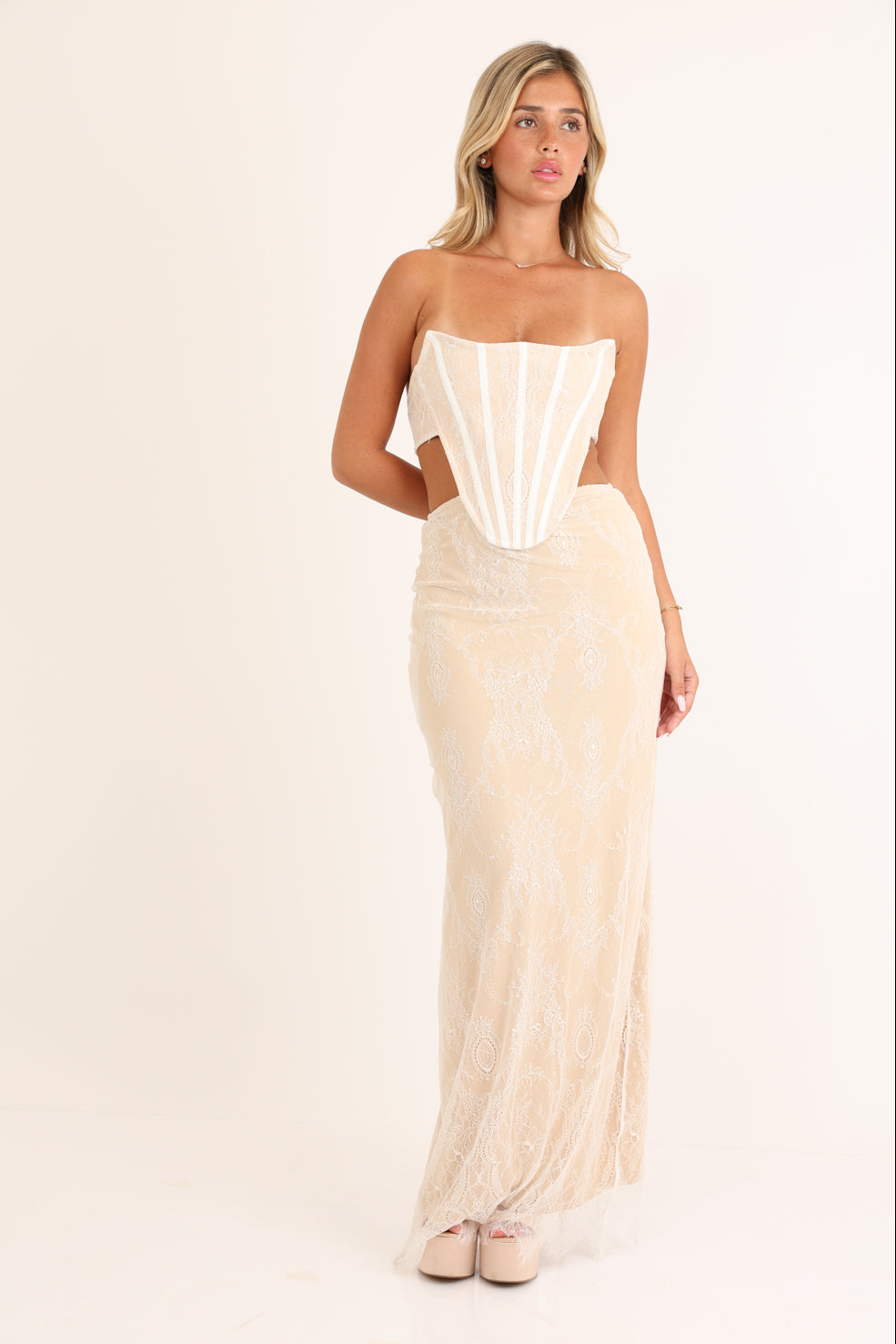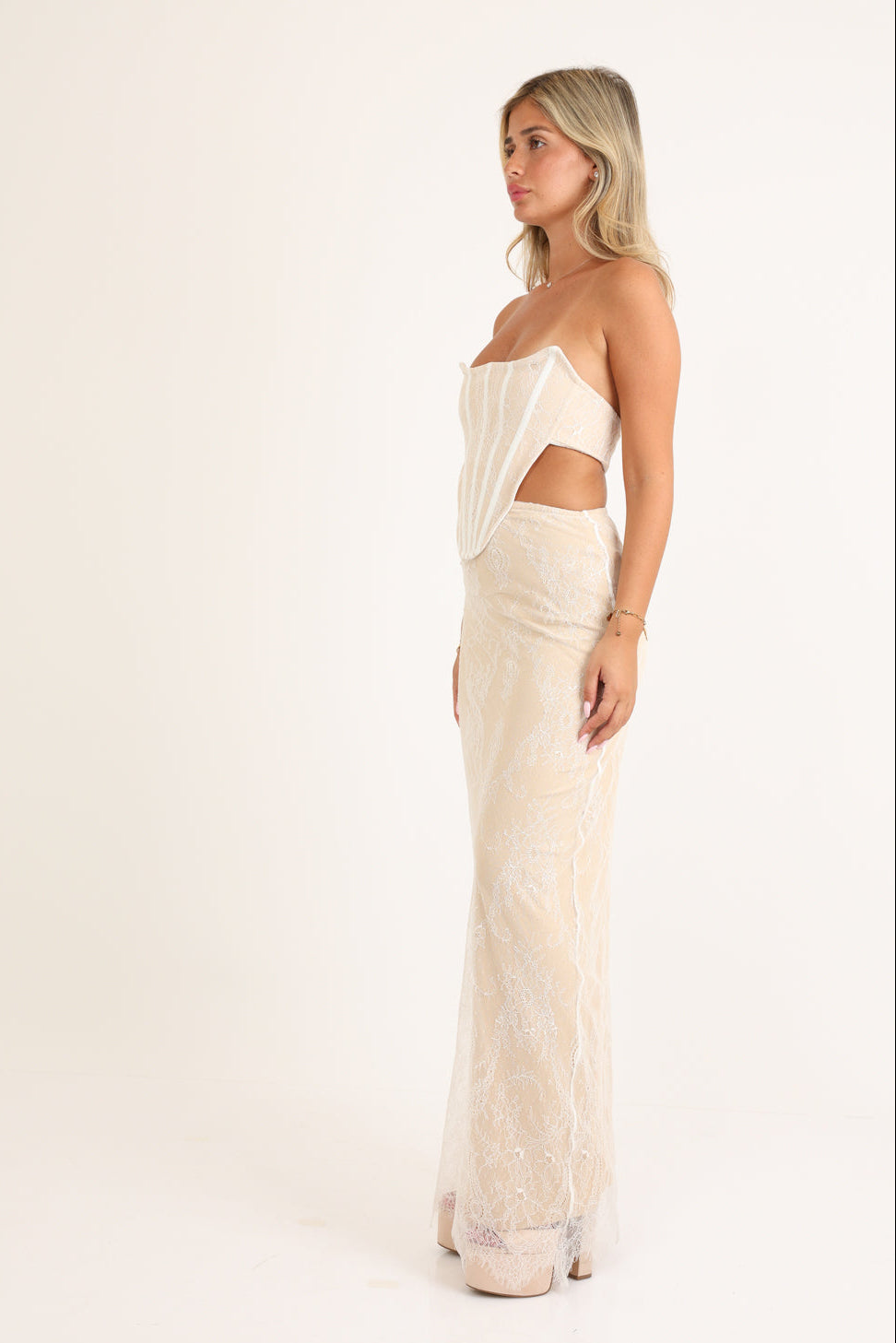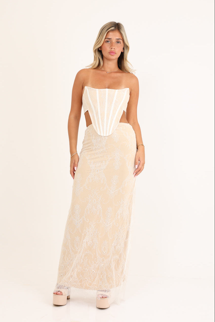 فستان سهرة طويل بدون حمالات، صدرية مدعمة بعظام، ومزين بالدانتيل مع فتحات.