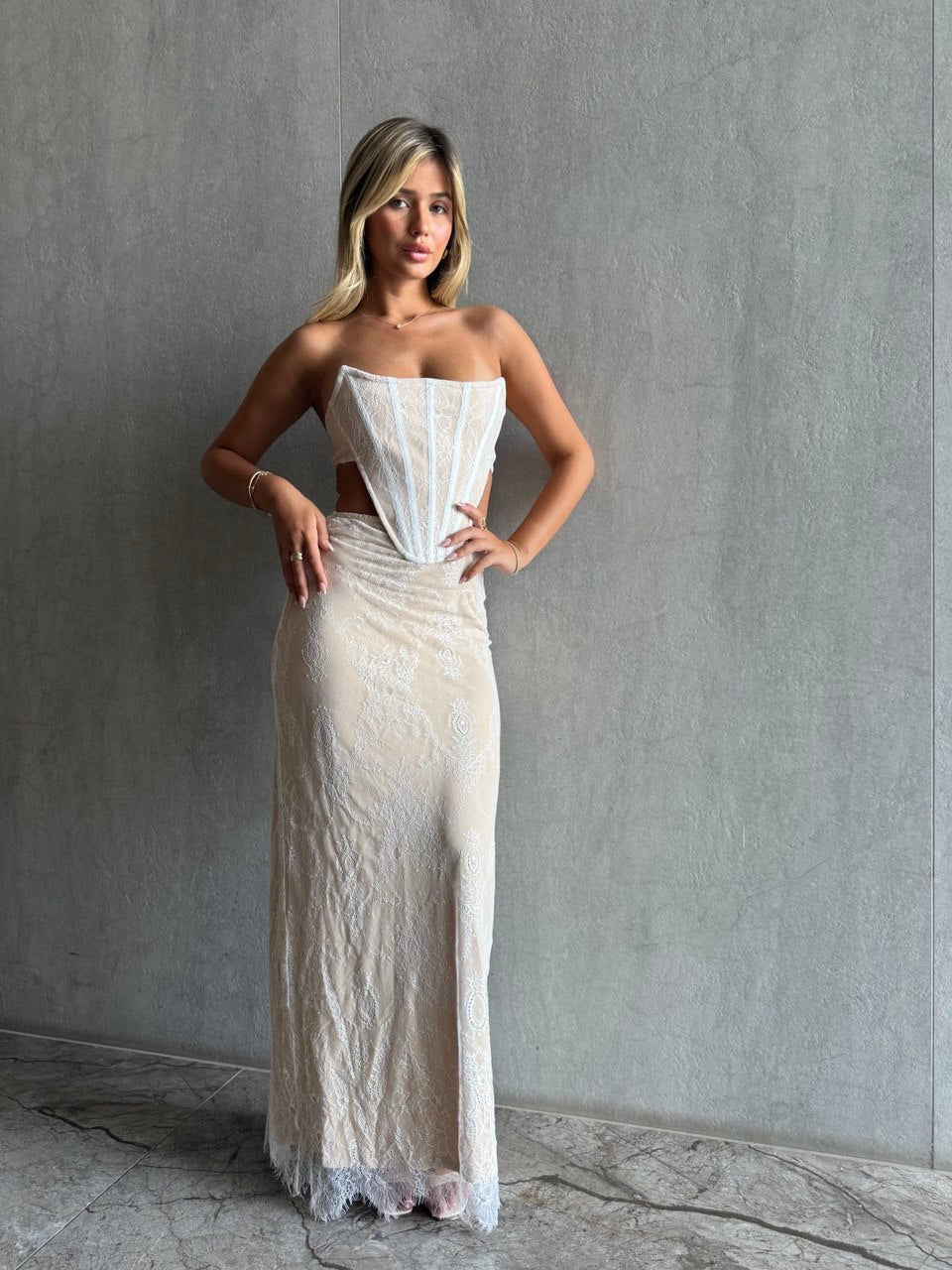 فستان ذكرى زواج من الدانتيل الكريمي