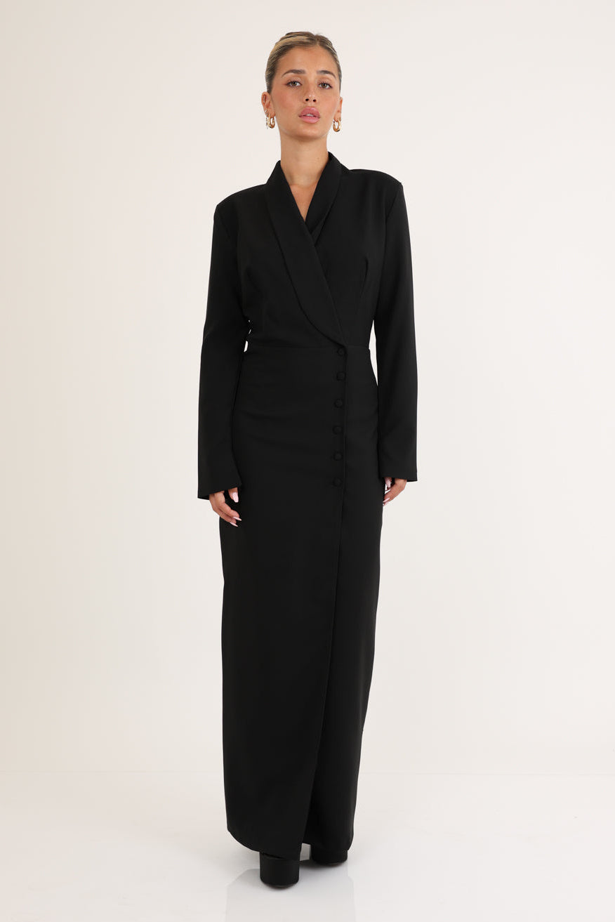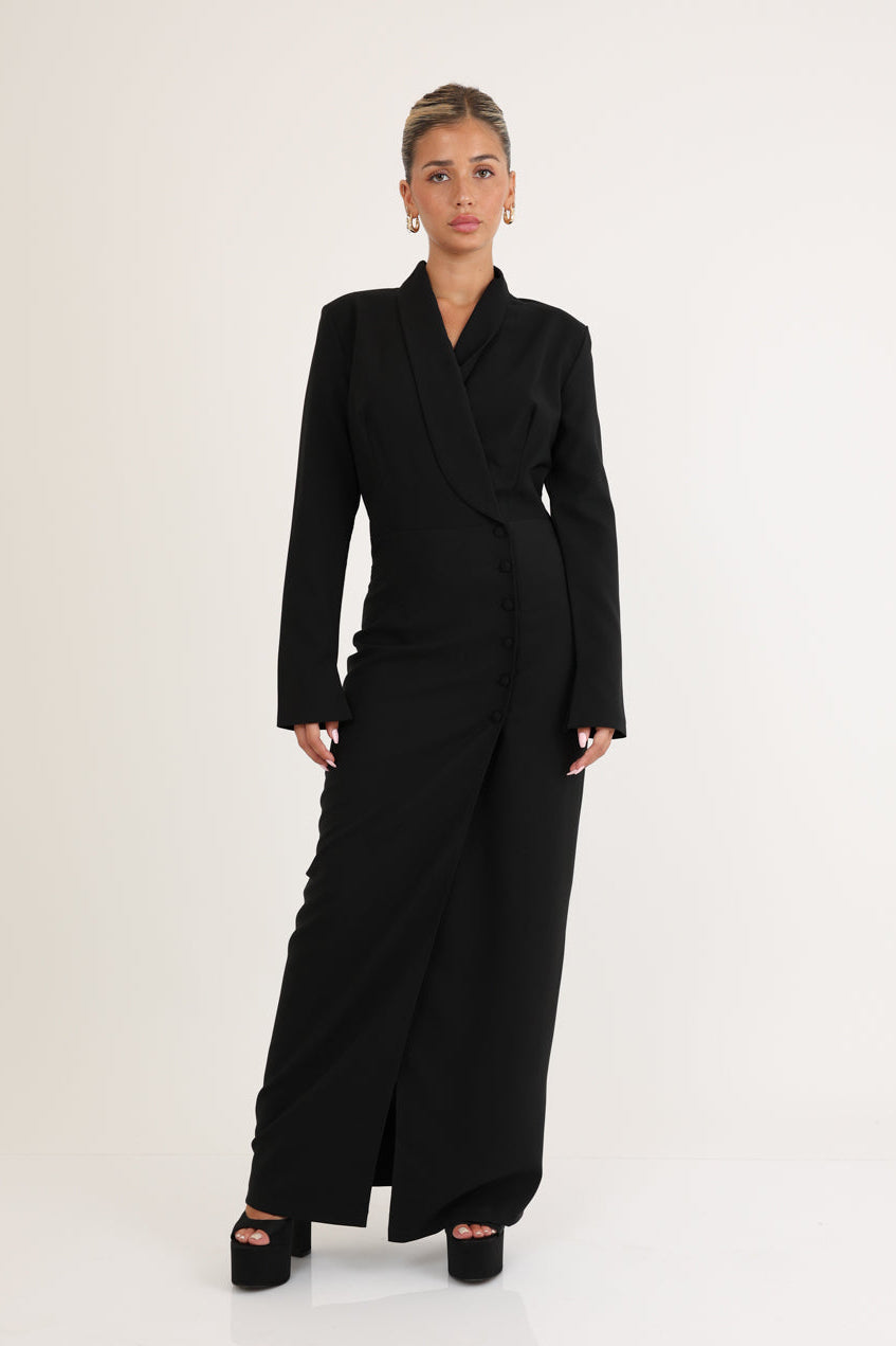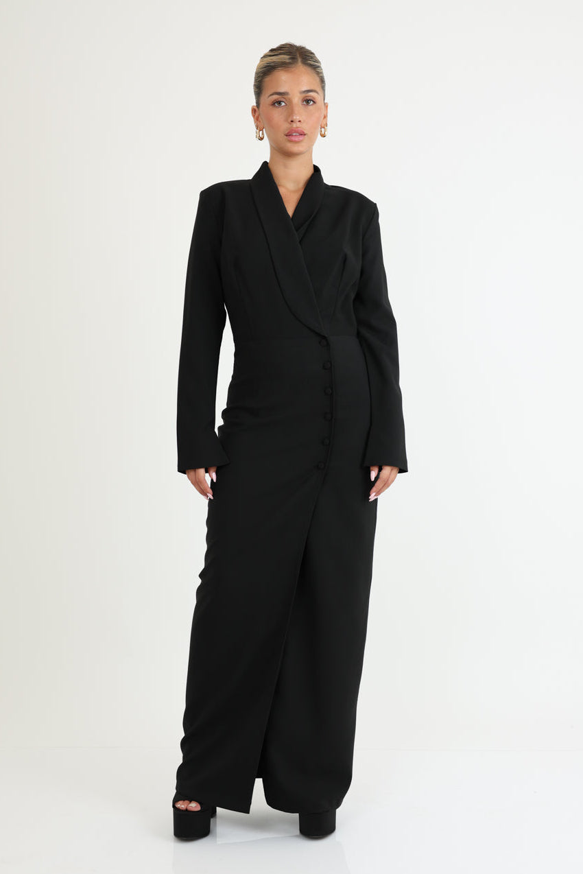 فستان كلاسيكي طويل بأزرار وياقة مغلفة