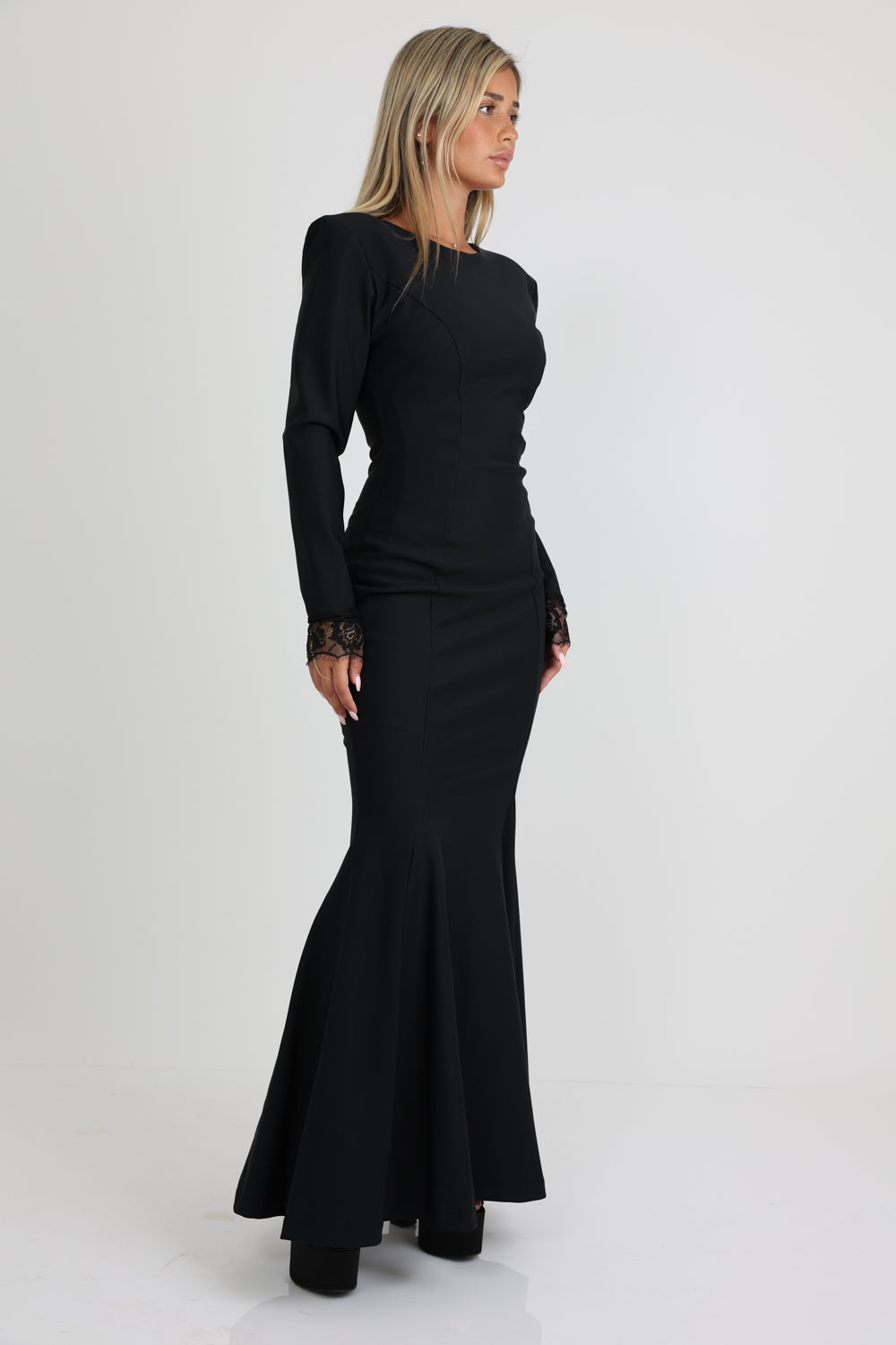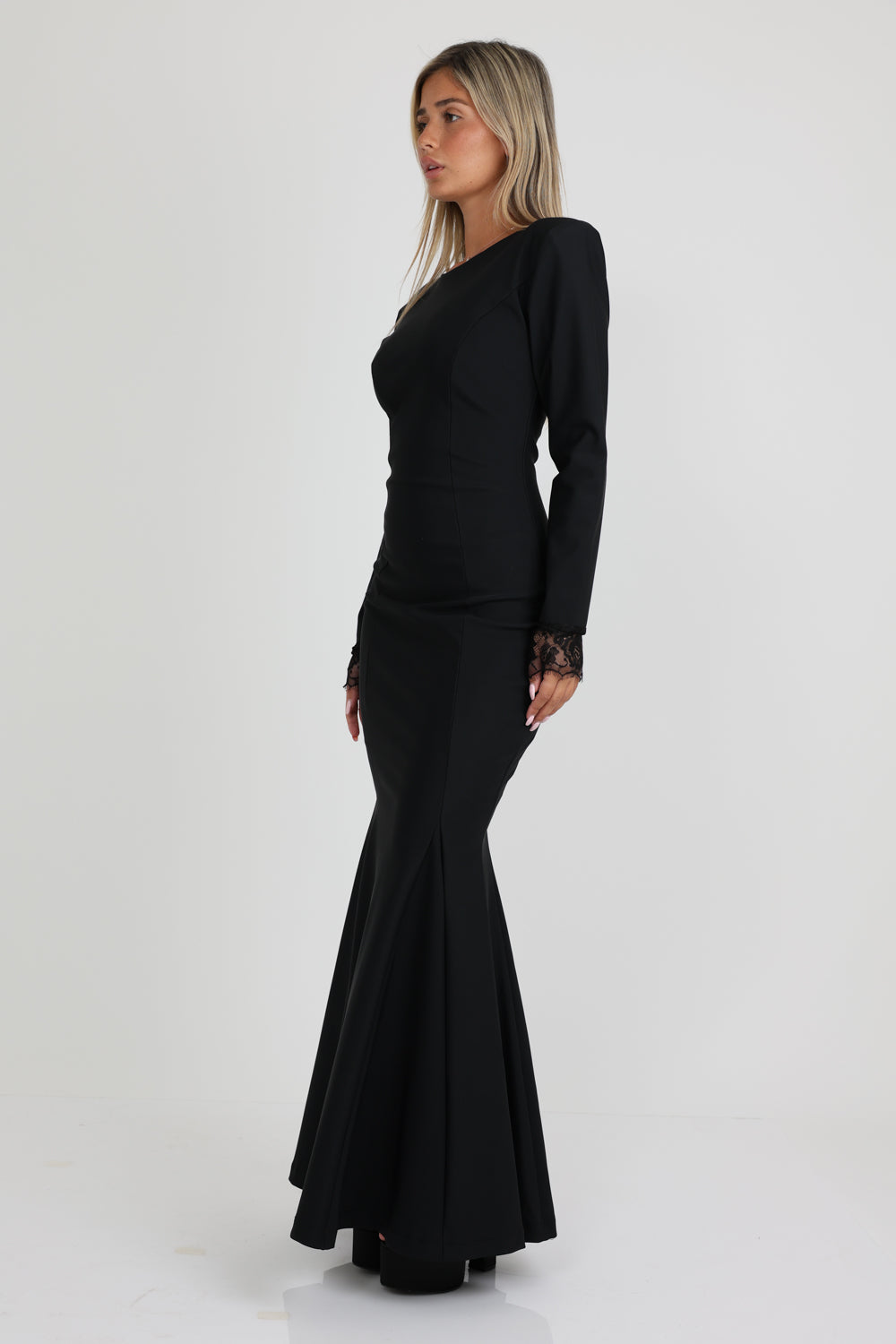 فستان سهرة بتصميم حورية البحر ضيق مع أكتاف مدمجة وأكمام مزينة بالدانتيل