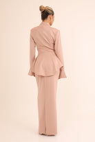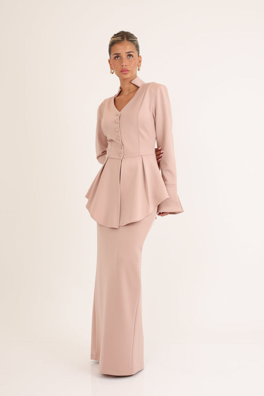 סט אלגנטי עליונית מחוייטת עם מחשוף וי כפתורים בחזית,חצאית קלאסית