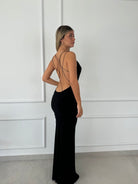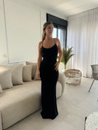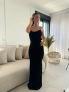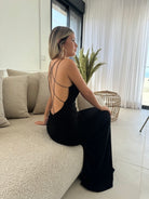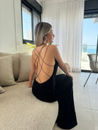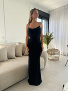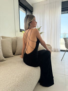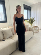 שמלה קלאסית בגזרה ארוכה וצמודה עם גב פתוח עמוק ורצועות דקות מצטלבות