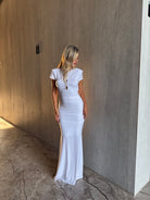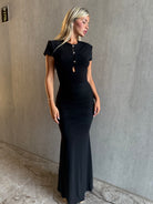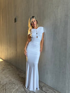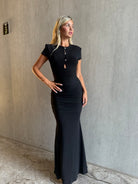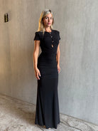 שמלה ארוכה עם פתחים קטנים בחזה בצירוף אבזמים קטניםכיווצים קטנים לטשטושֿ