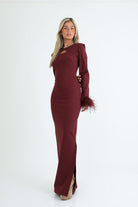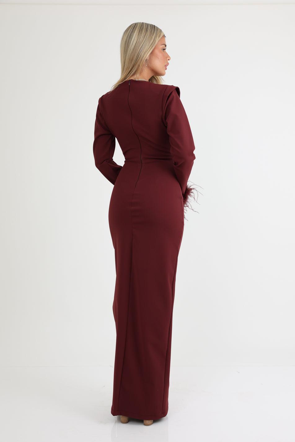 שמלה עם חתך עדין באזור החזה עם כתפיים מודגשות ושרוולים ארוכים עם פרנזים נוצתיים בקצוות