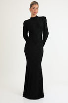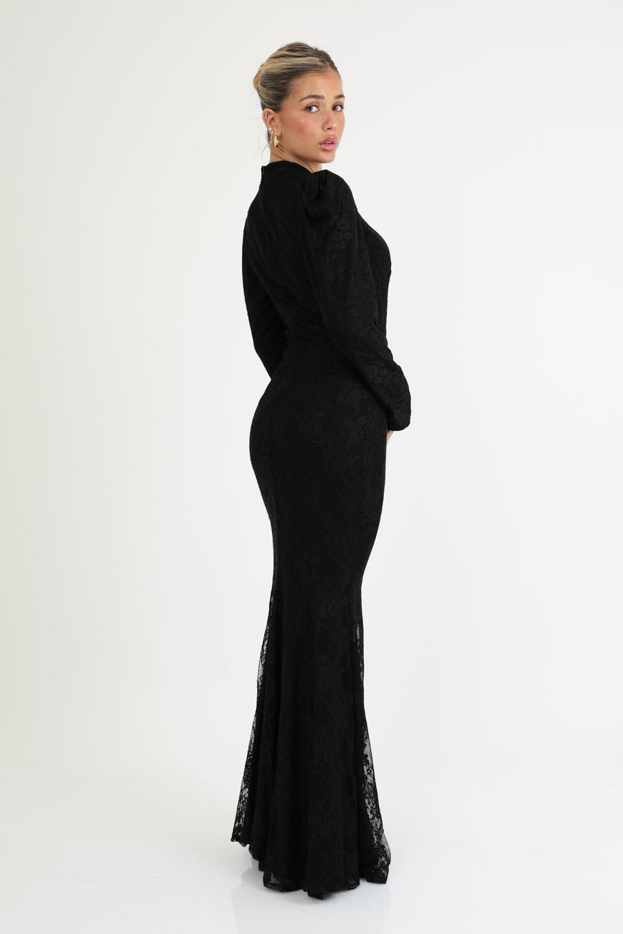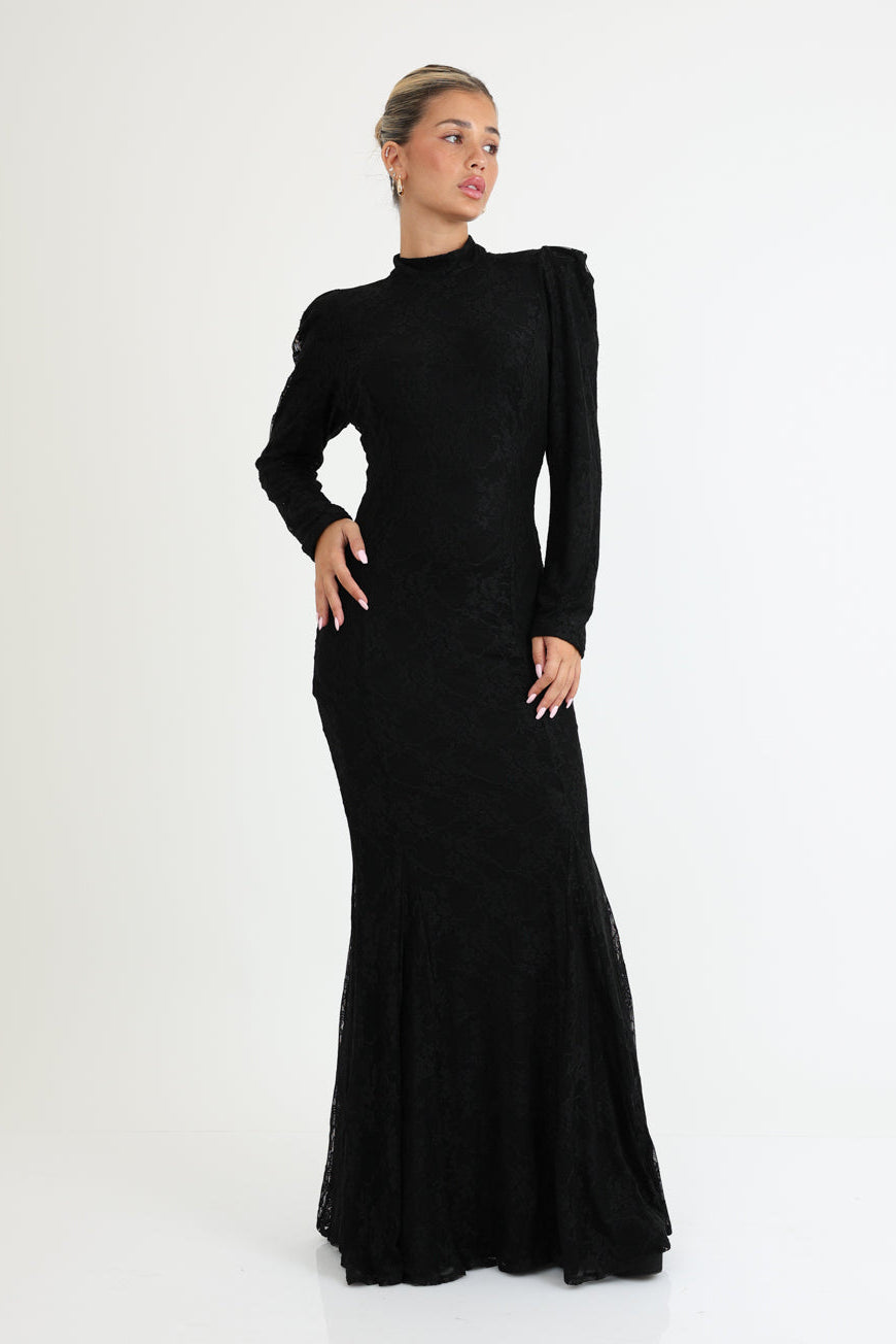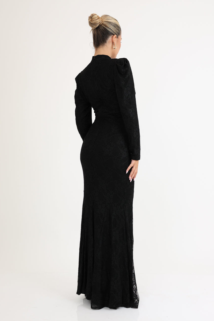 שמלת מקסי אלגנטית מתחרה שחורה עם בטנה בגוון ניוד/בז' היוצרת קונטרסט ומדגישה את דוגמת התחרה.