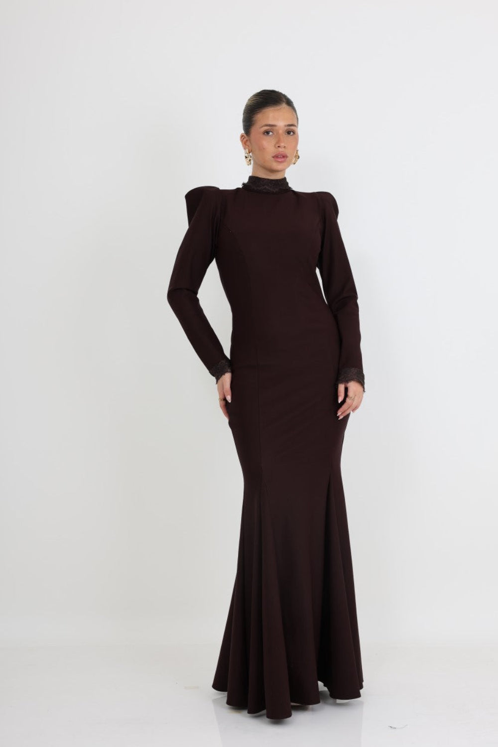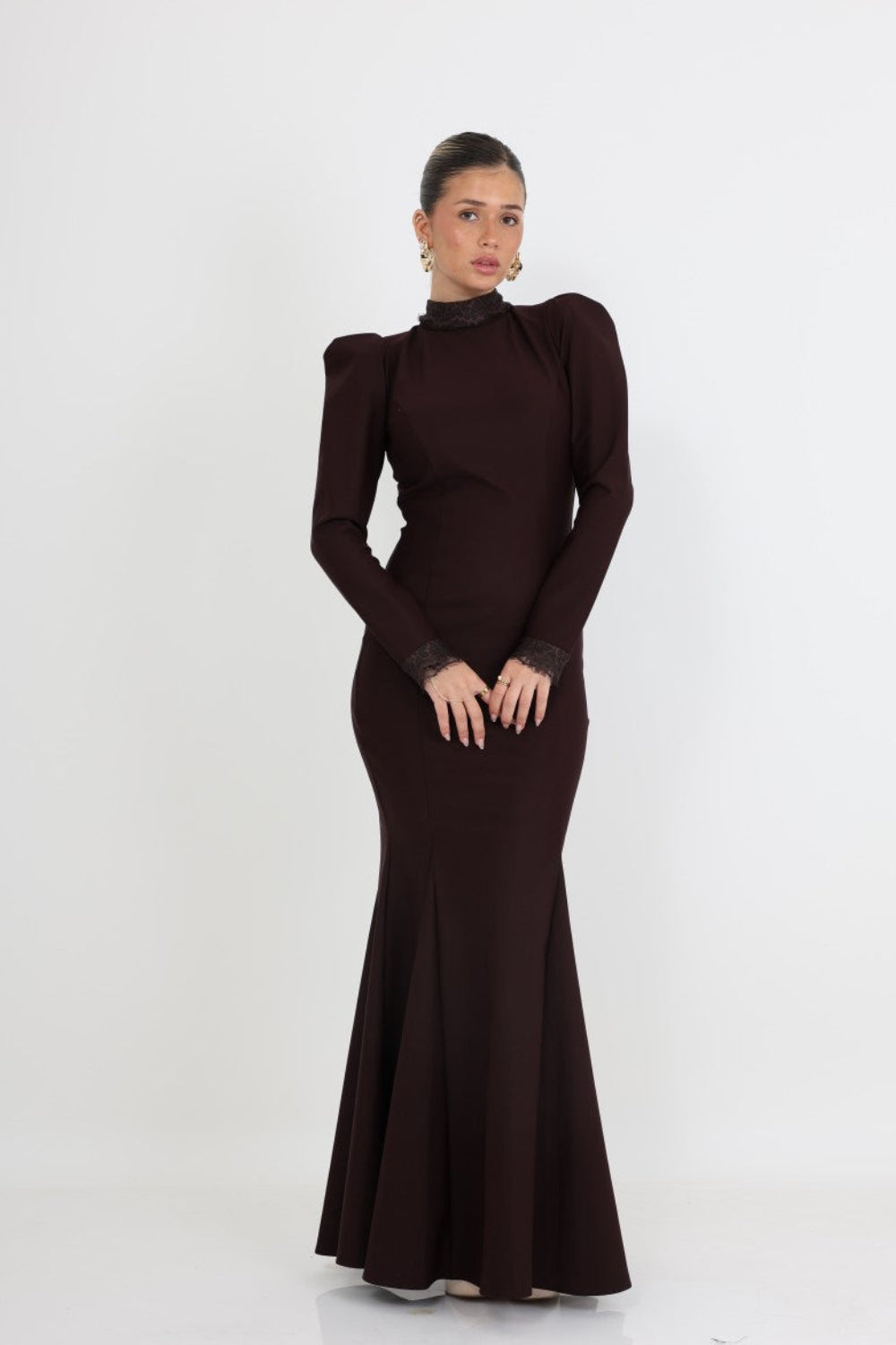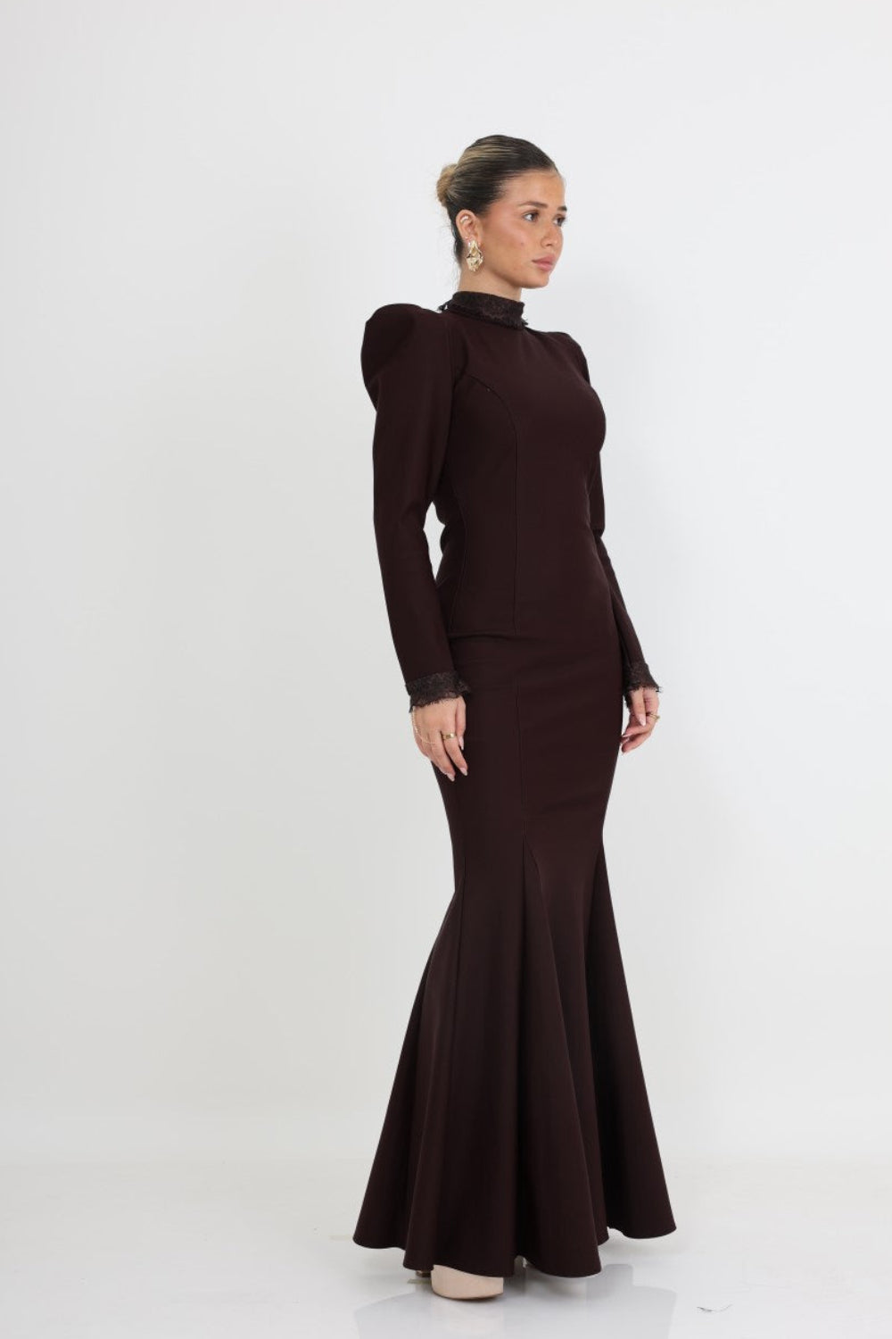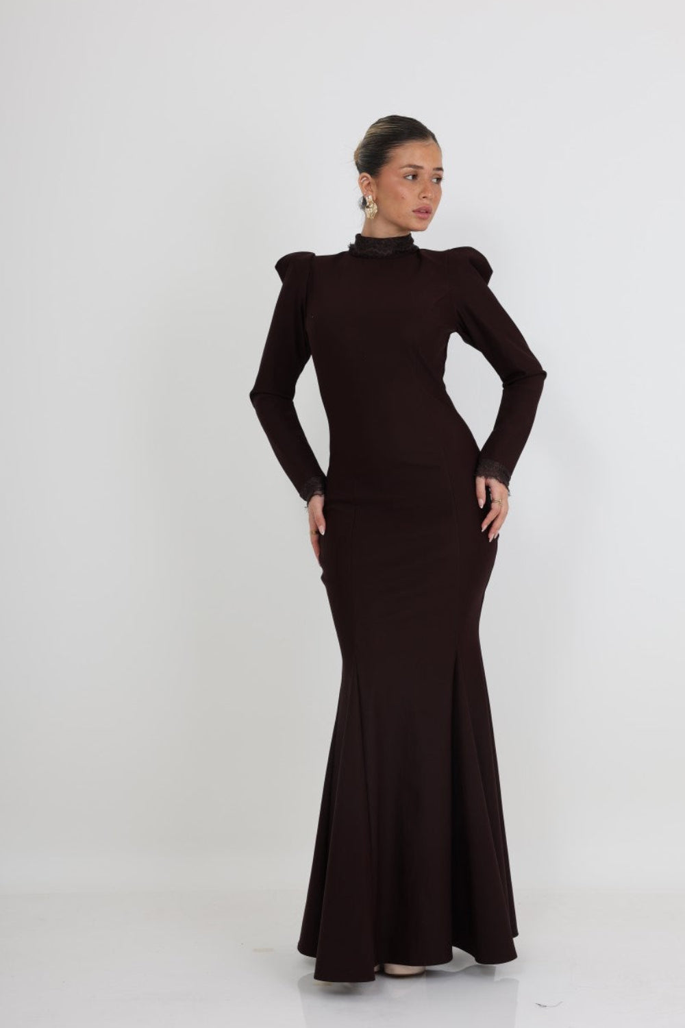 השרוולים הארוכים מסתיימים בעיטור תחרה עדין, המוסיף טאץ' רומנטי ותחושת יוקרה. הצווארון הגבוה מעניק לשמלה מראה אצילי ומעודן, המתאים במיוחד לאירועים חגיגיים ואלגנטיים.