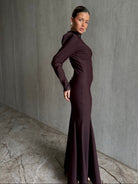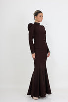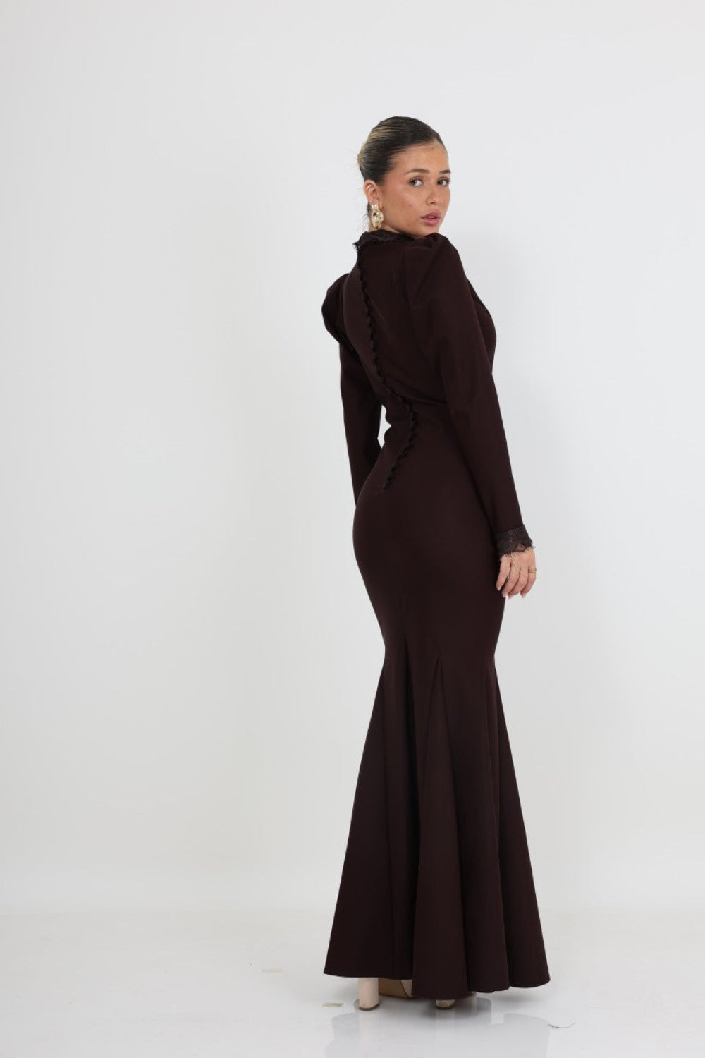 גב השמלה מעוצב בקו נקי עם שורת כפתורים דקורטיביים לאורך המרכז, המבליטים את הצללית הנשית ויוצרים מראה מרשים מכל זווית.