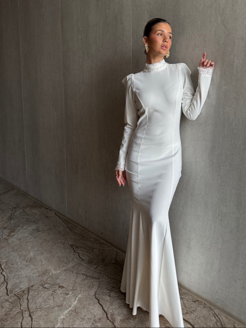 השרוולים הארוכים מסתיימים בעיטור תחרה עדין, המוסיף טאץ' רומנטי ותחושת יוקרה. הצווארון הגבוה מעניק לשמלה מראה אצילי ומעודן, המתאים במיוחד לאירועים חגיגיים ואלגנטיים.