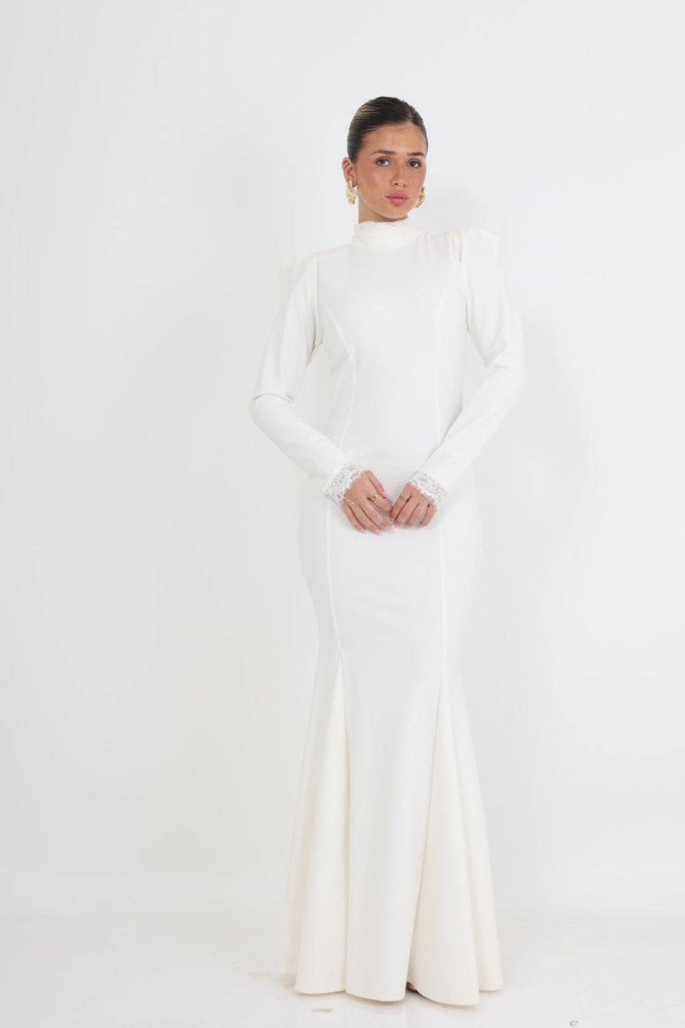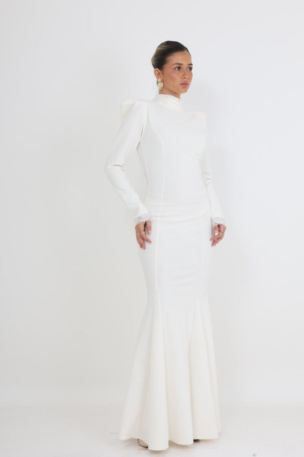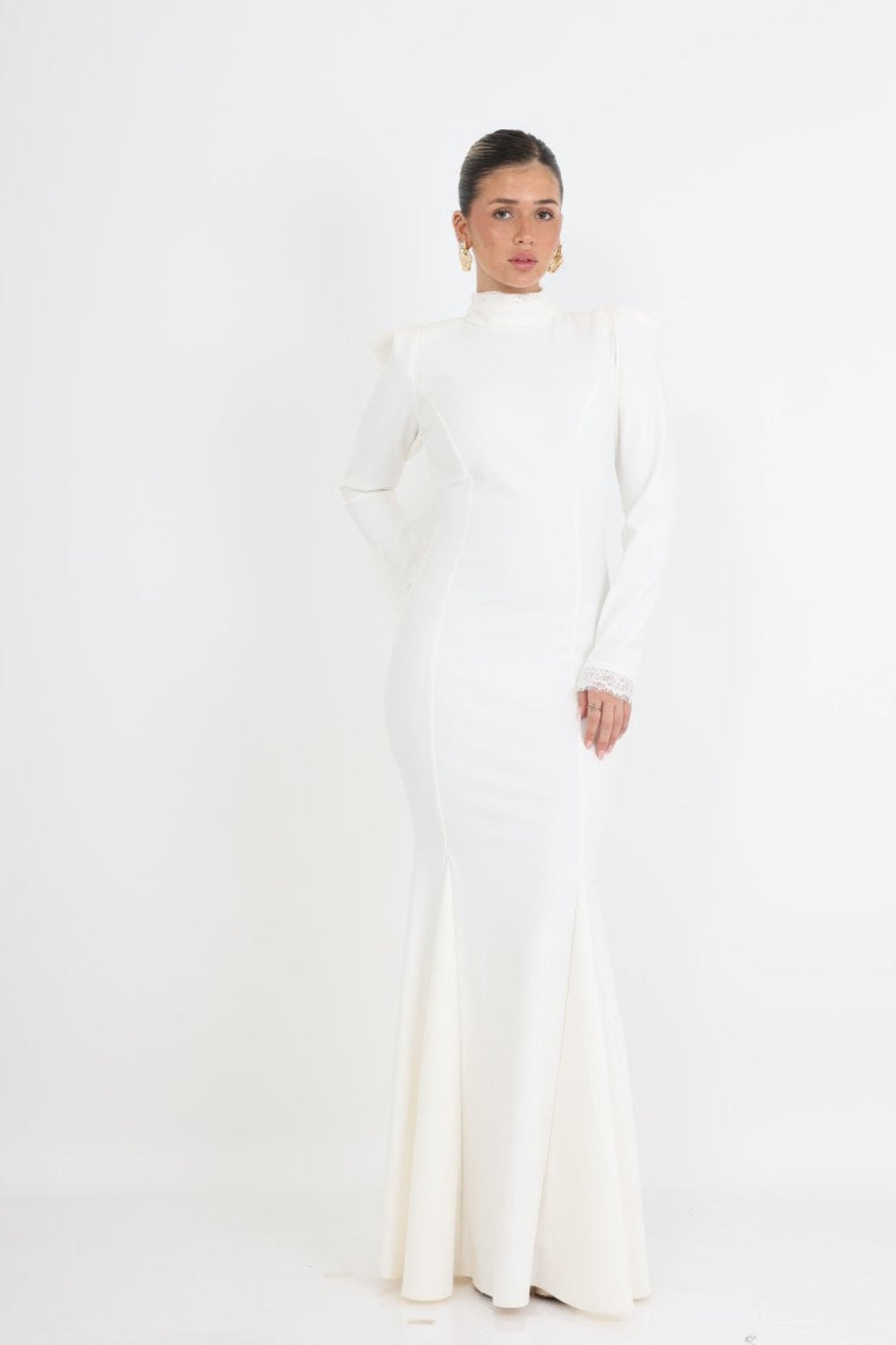 שמלת ערב מקסי בצבע לבן נקי, בעיצוב קלאסי ואלגנטי המשלב מראה יוקרתי עם קווים נשיים מחמיאים. הגזרה הצמודה מדגישה את קווי הגוף בצורה עדינה ומחטבת, בעוד החלק התחתון מתרחב בעדינות ליצירת נפילה רכה ואלגנטית.