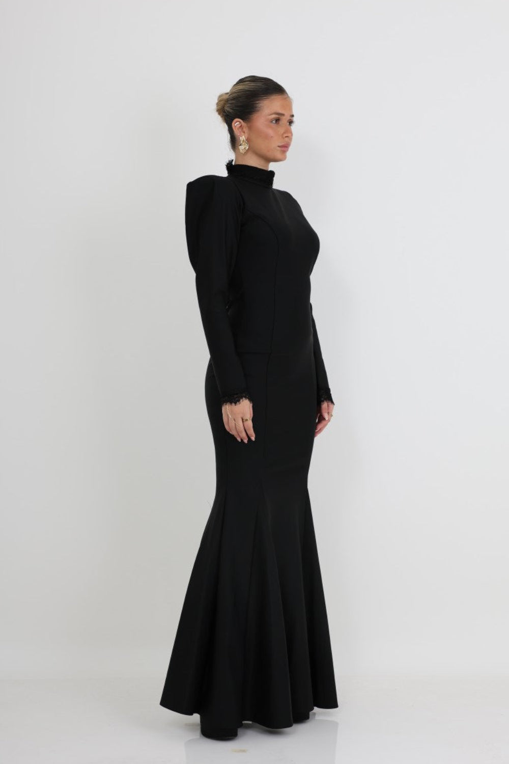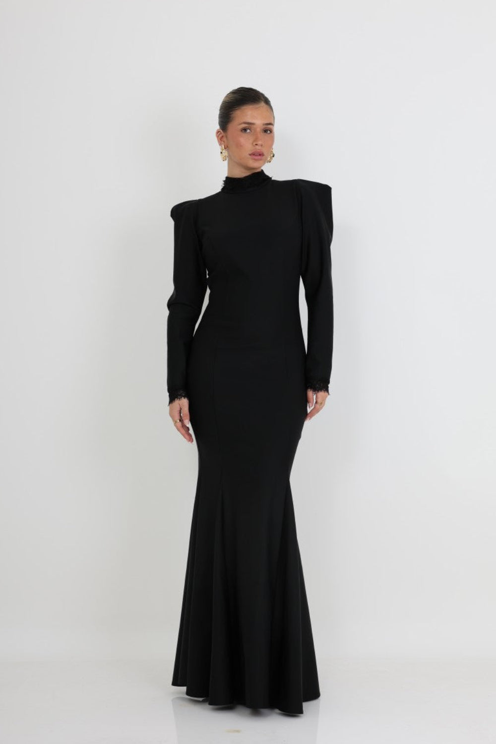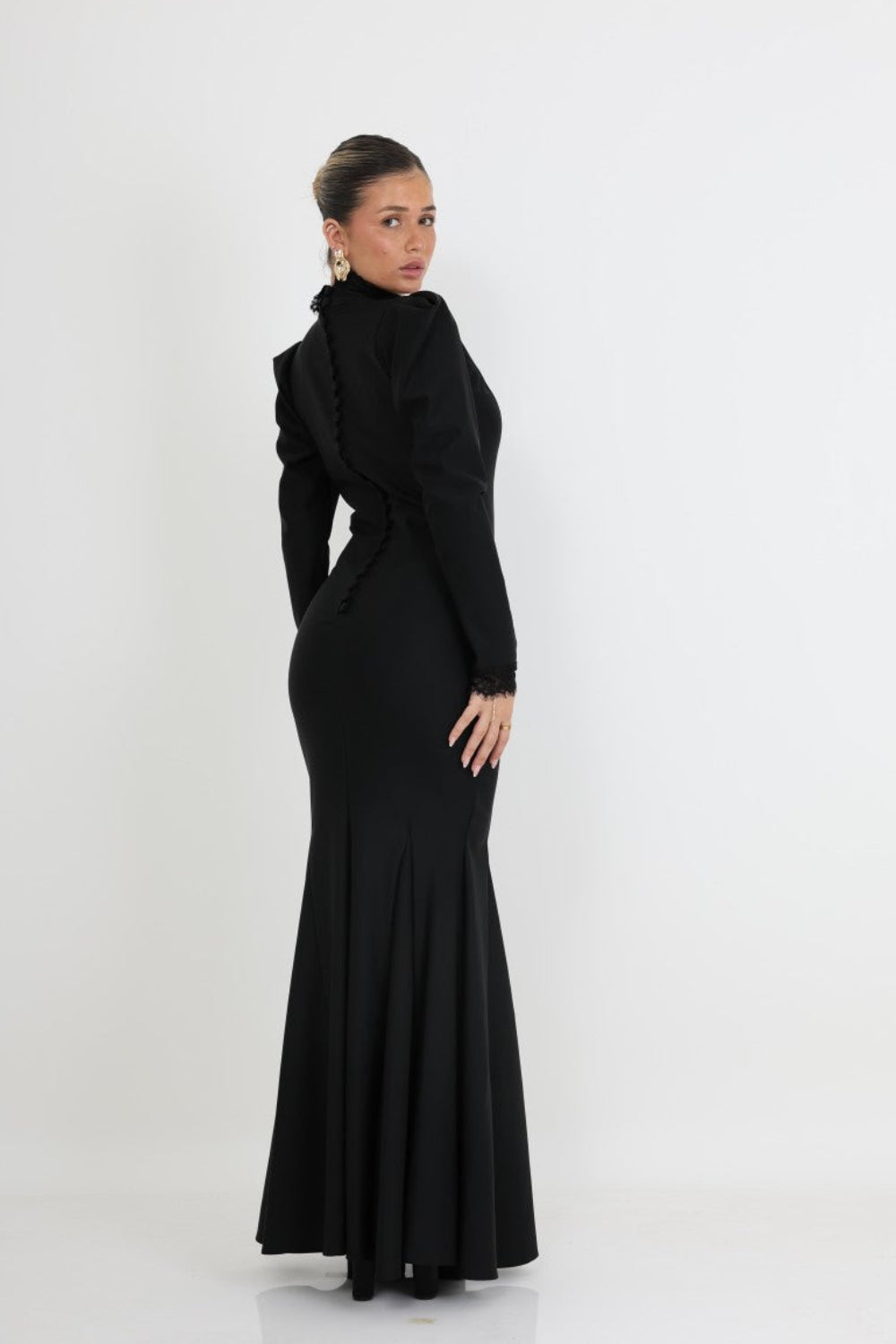 השרוולים הארוכים מסתיימים בעיטורי תחרה עדינים, המוסיפים נגיעה רומנטית ויוקרתית. הכתפיים המעוצבות מעניקות מראה אצילי ומודרני, והצווארון הגבוה משדר תחכום ואלגנטיות מושלמת לאירועי ערב.
