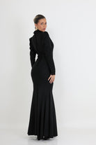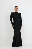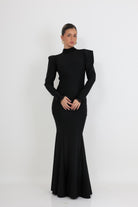 שמלת ערב מקסי שחורה בעיצוב אלגנטי ומוקפד, המשלבת קווים נקיים עם נוכחות נשית עוצמתית. הגזרה הצמודה מחטבת את הגוף ומדגישה את קווי המותן והירך, בעוד החלק התחתון מתרחב בעדינות ליצירת מראה דרמטי וזורם.