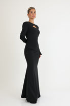 שמלת ערב ארוכה בגזרת בת -הים שרוולים ארוכים ופתח אלגנטי בחזה