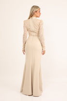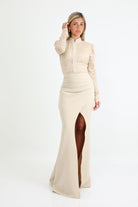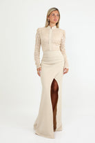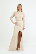 שמלה ארוכה בשילוב תחרה צווארון קטן, ושסע בחצאית