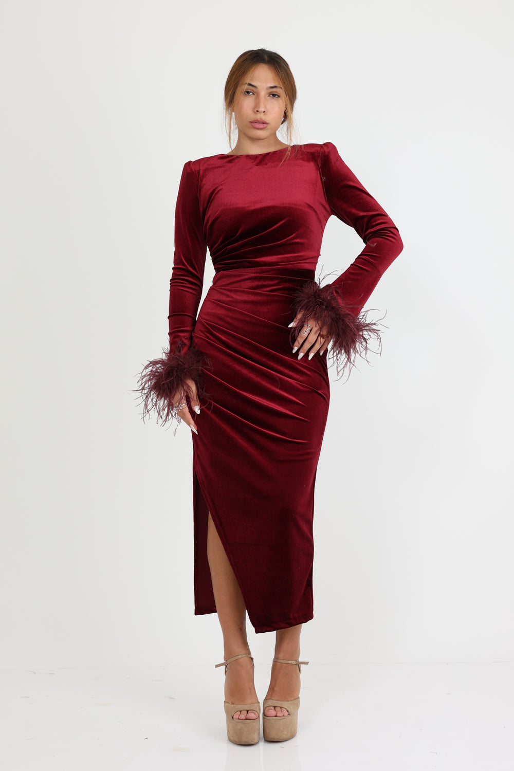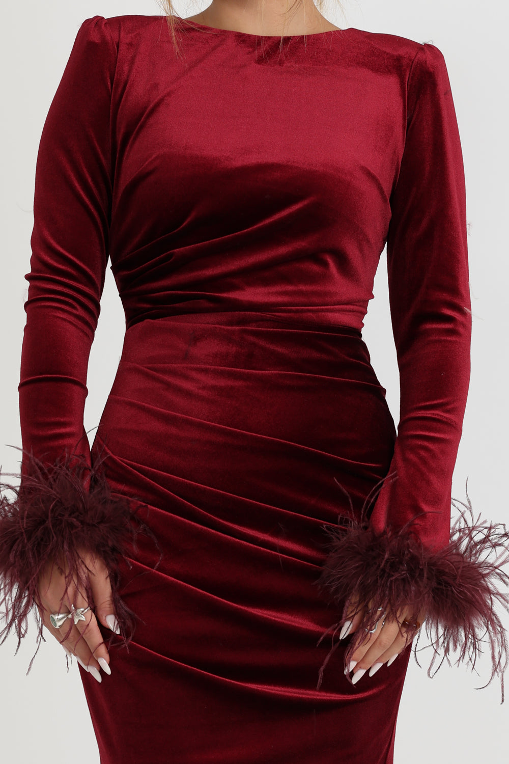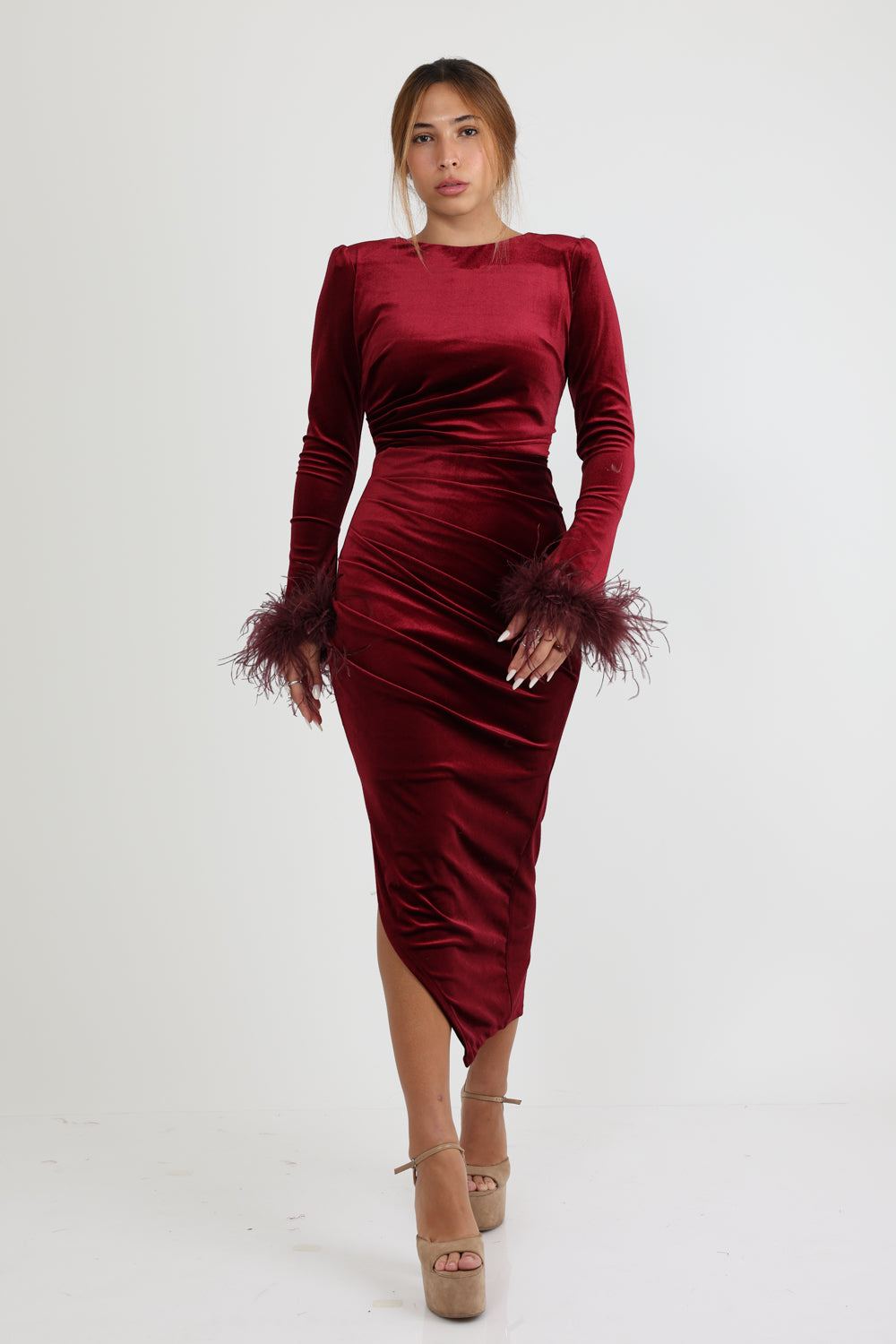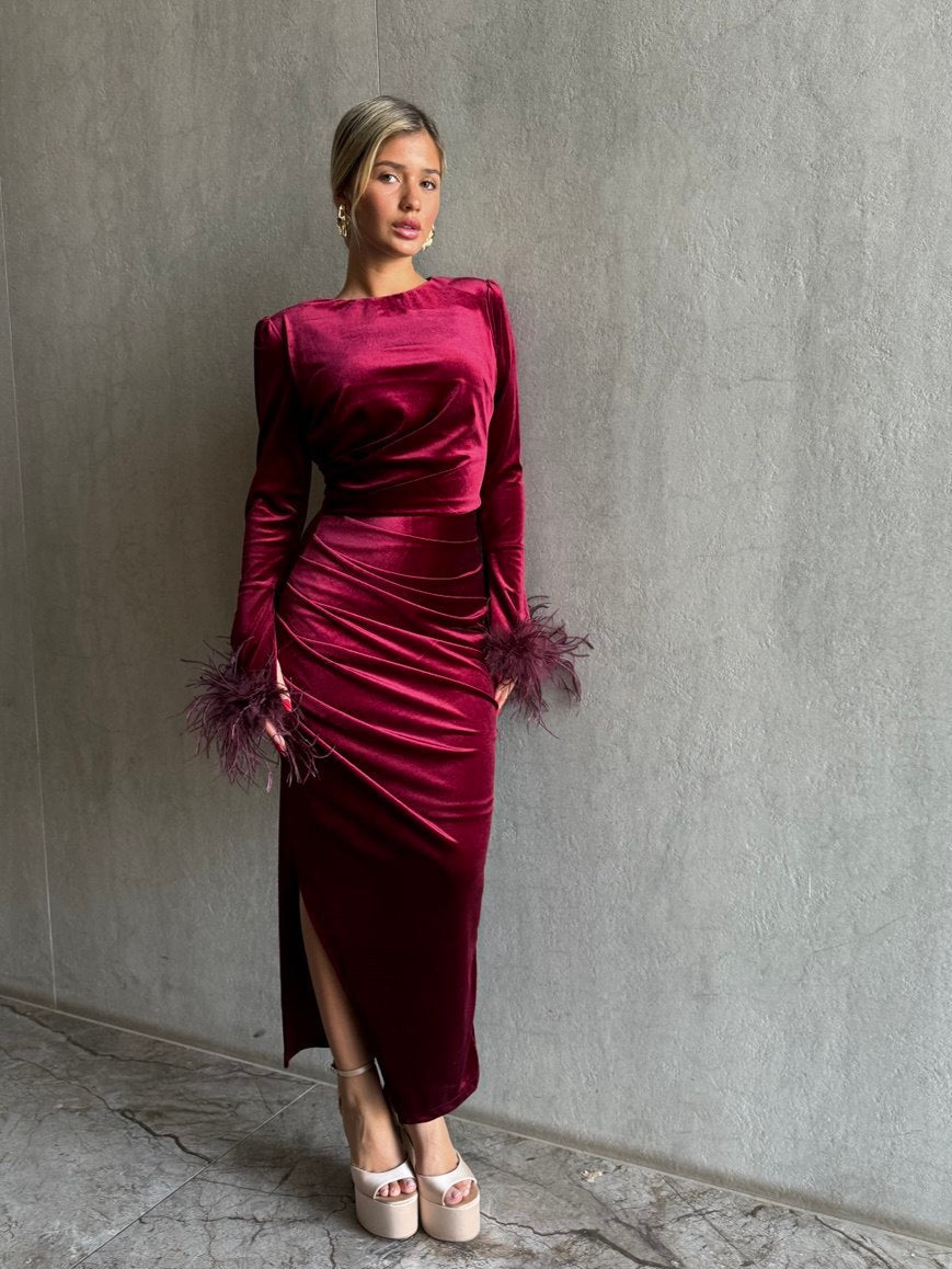 שמלה מידי מבד קטיפה כיווצים במותן ,שרוולים סיומת נוצות