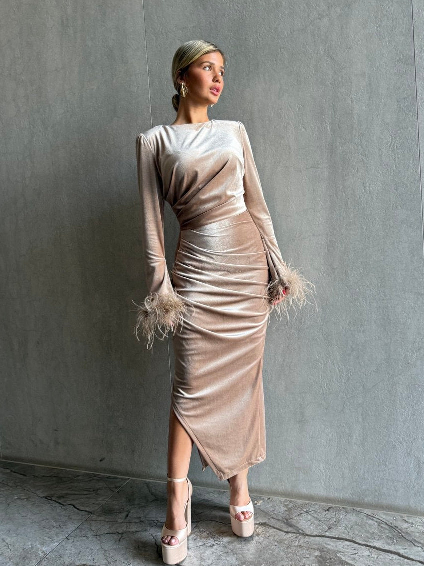 שמלה מידי מבד קטיפה כיווצים במותן ,שרוולים סיומת נוצות