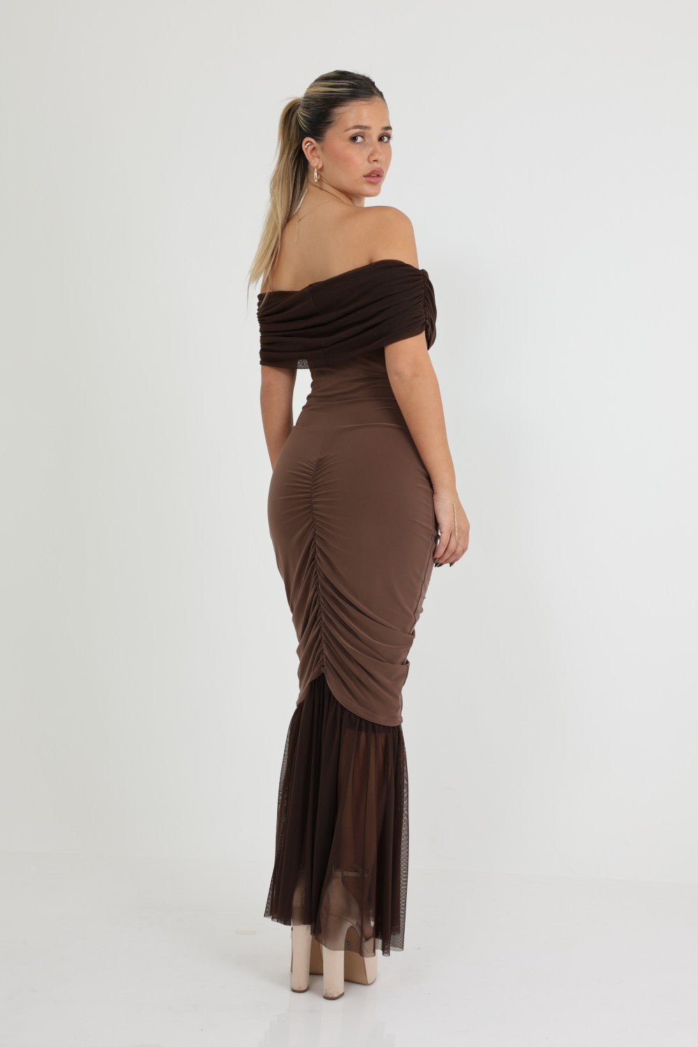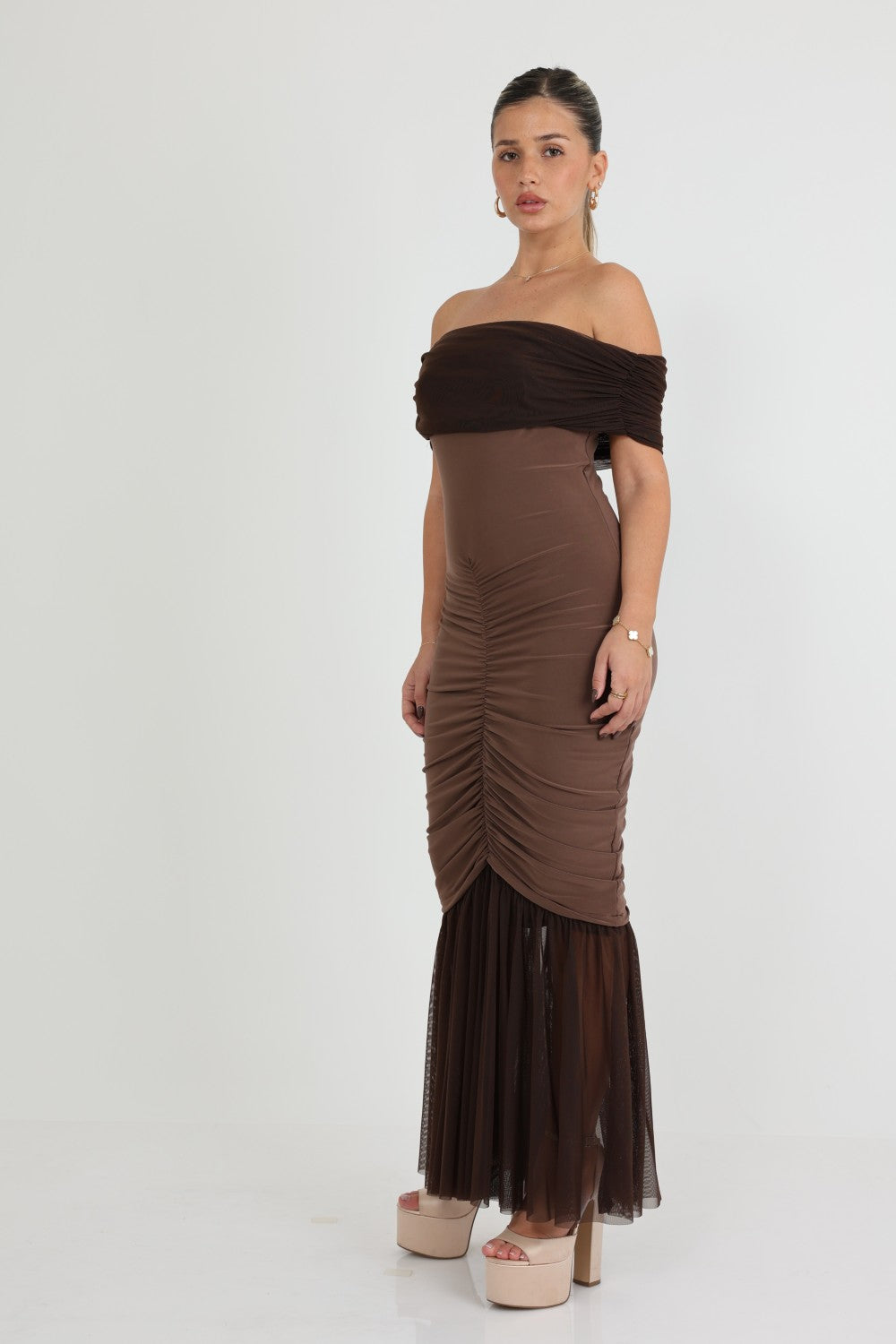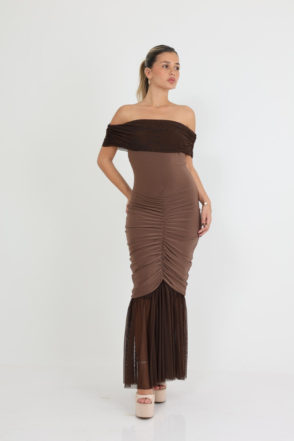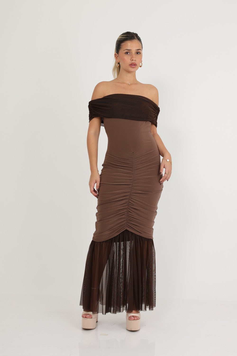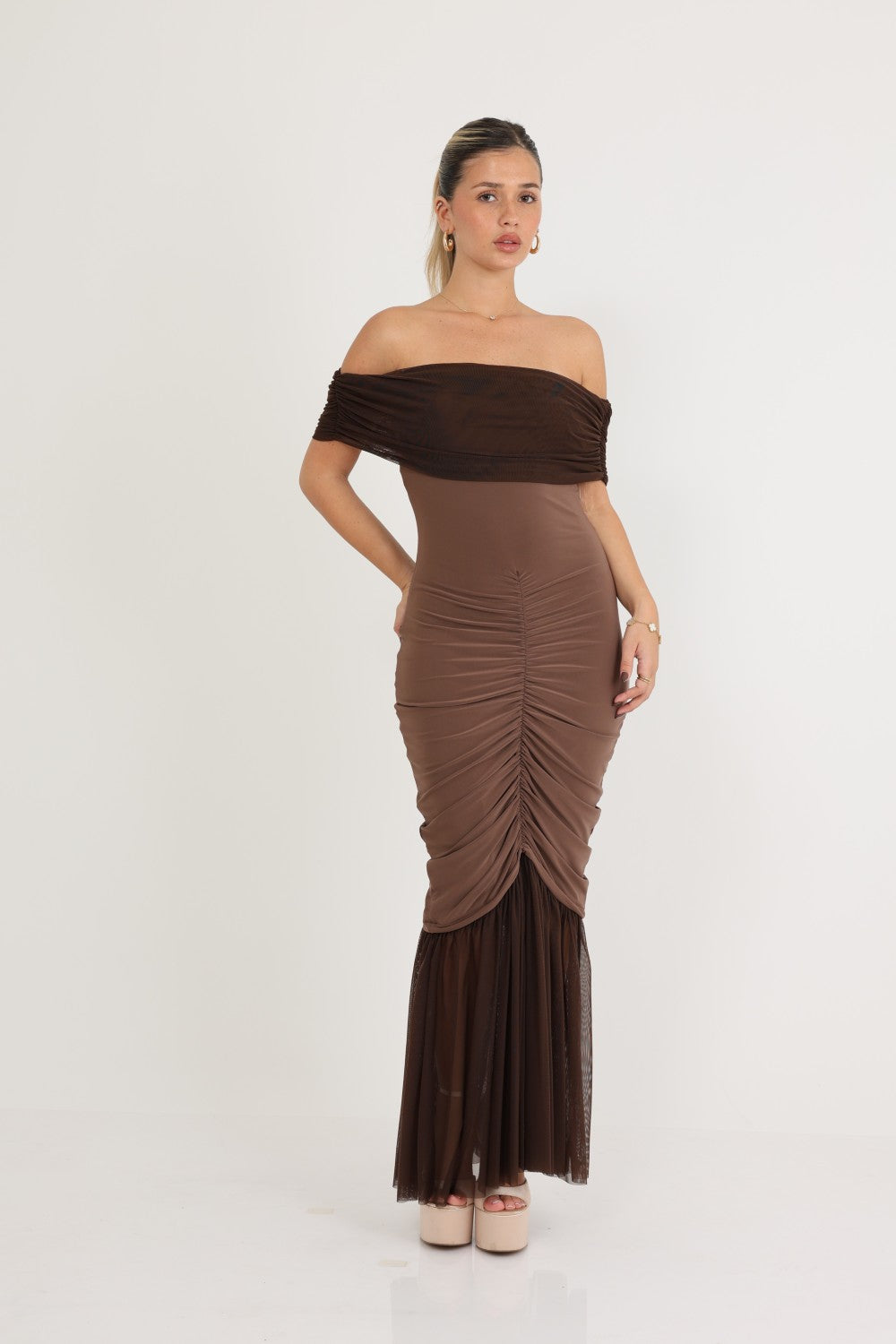 שמלה אוף שולדרס אלגנטית בעלת כיווצים לאורך  הגוף חלק תחתון נשפך שיפון
