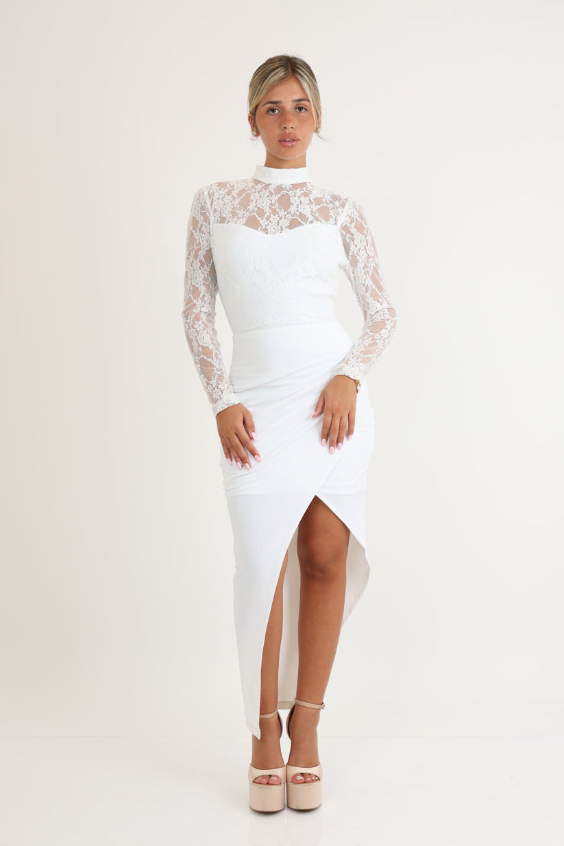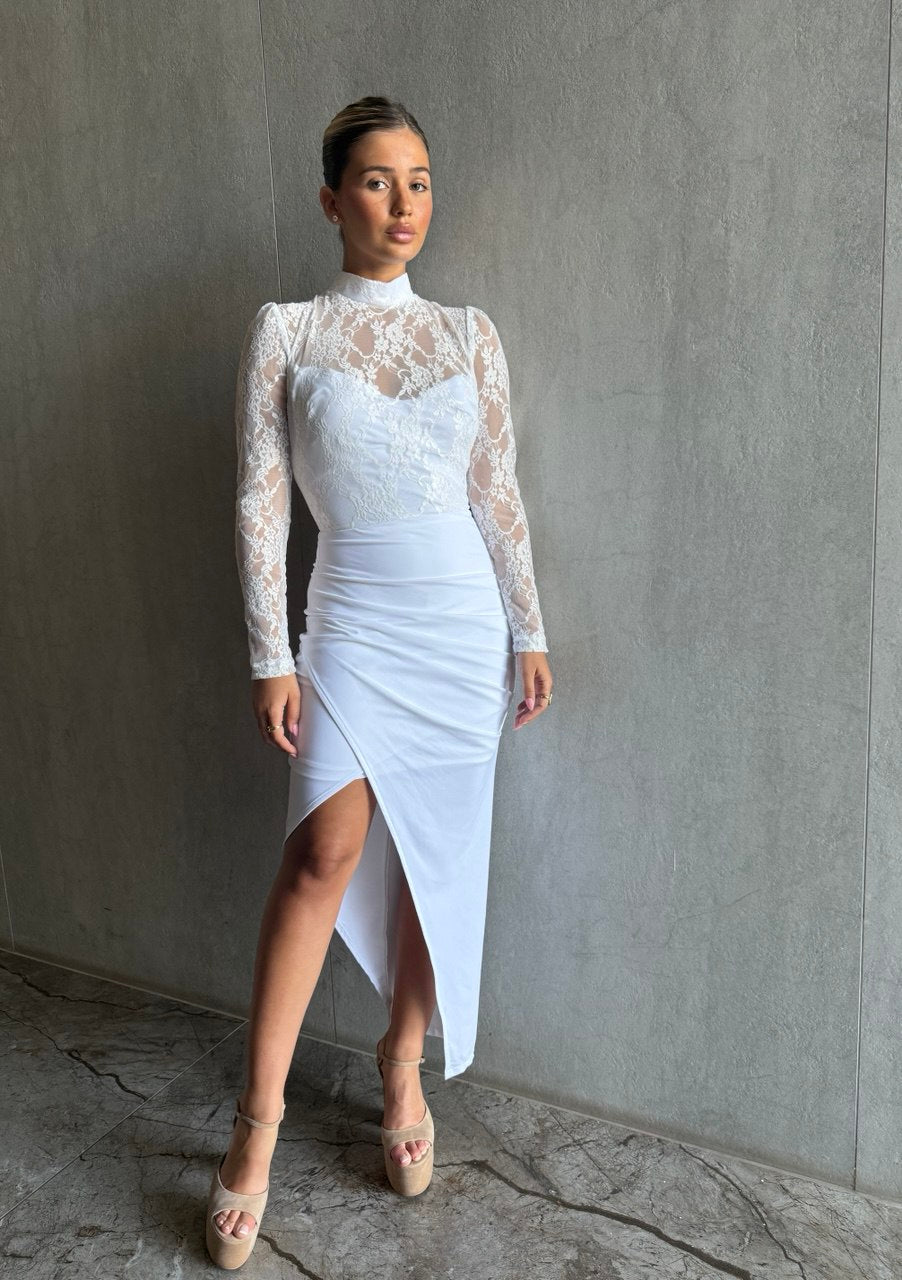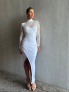 שמלה אלגנטית תחרה בחלק העליון צווארון סגור ושסע קדמי .