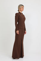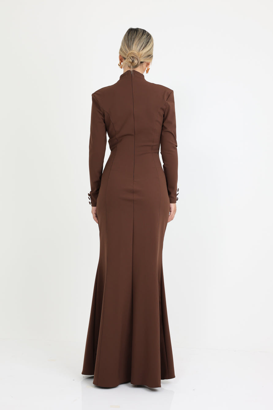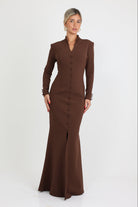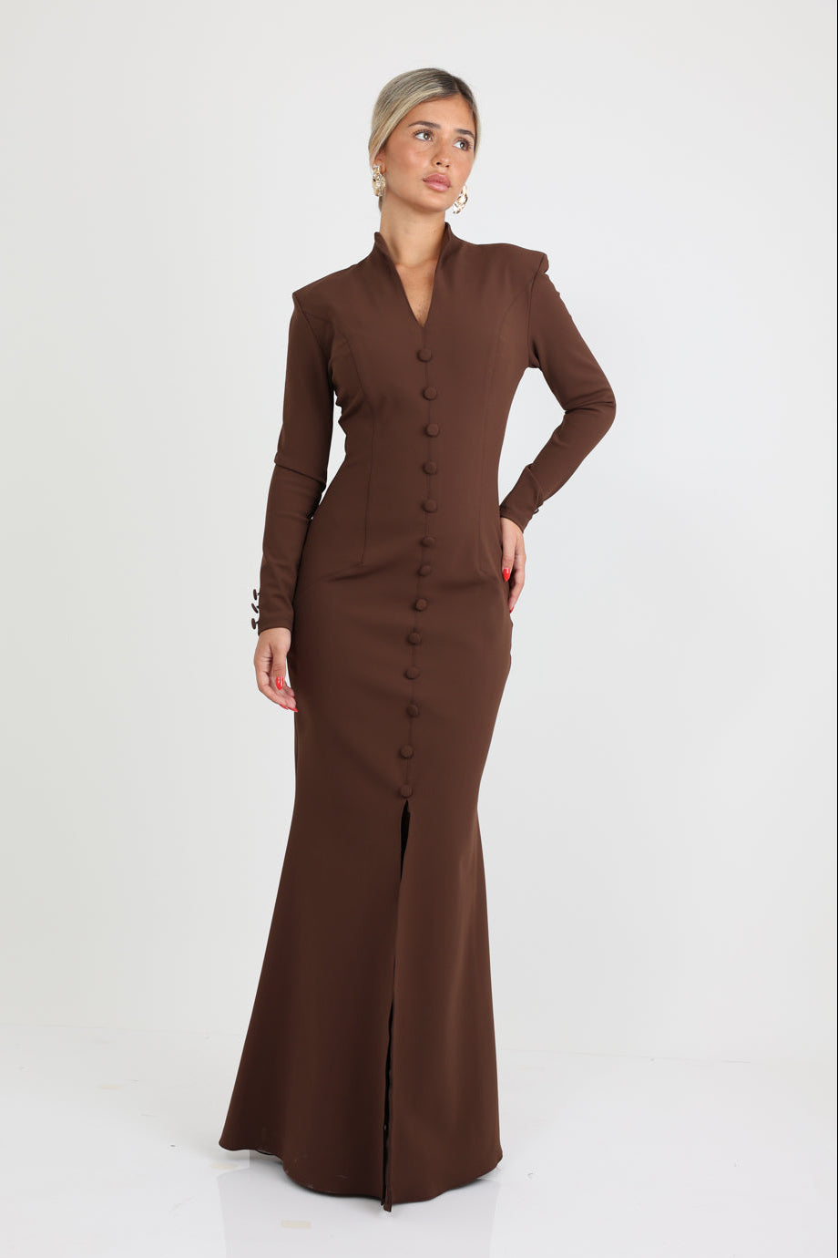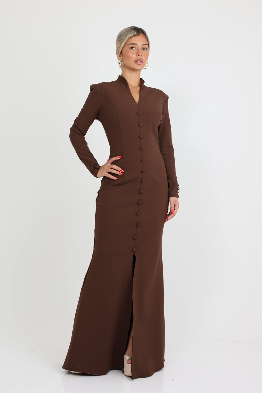 שמלה מחוייטת עם כפתורים לאורכה, גזרה מחטבת עם כתפיים מודגשות ופתח קדמי עדין