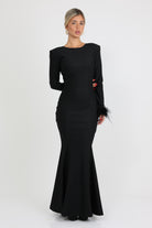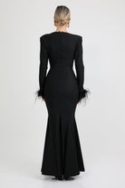 שמלה אלגנטית ארוכה בגזר מתרחהת , בשרוולים נוצות
