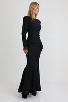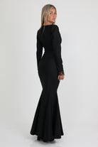 שמלה ערב בגזרת בת-ים צמודה עם כתפיים מובנות ושרוולים בעיתור תחרה