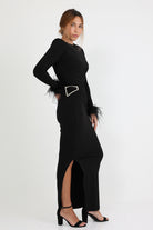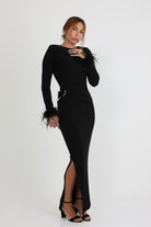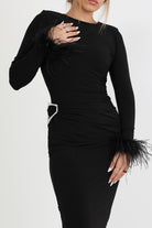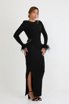 שמלה ארוכה עם כיווצים במותן בצירוף אבזם , בשרוולים סיומת של נוצות