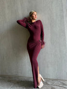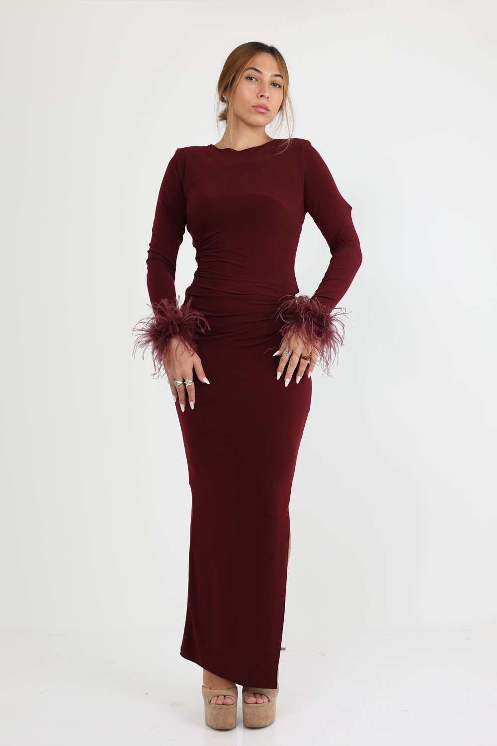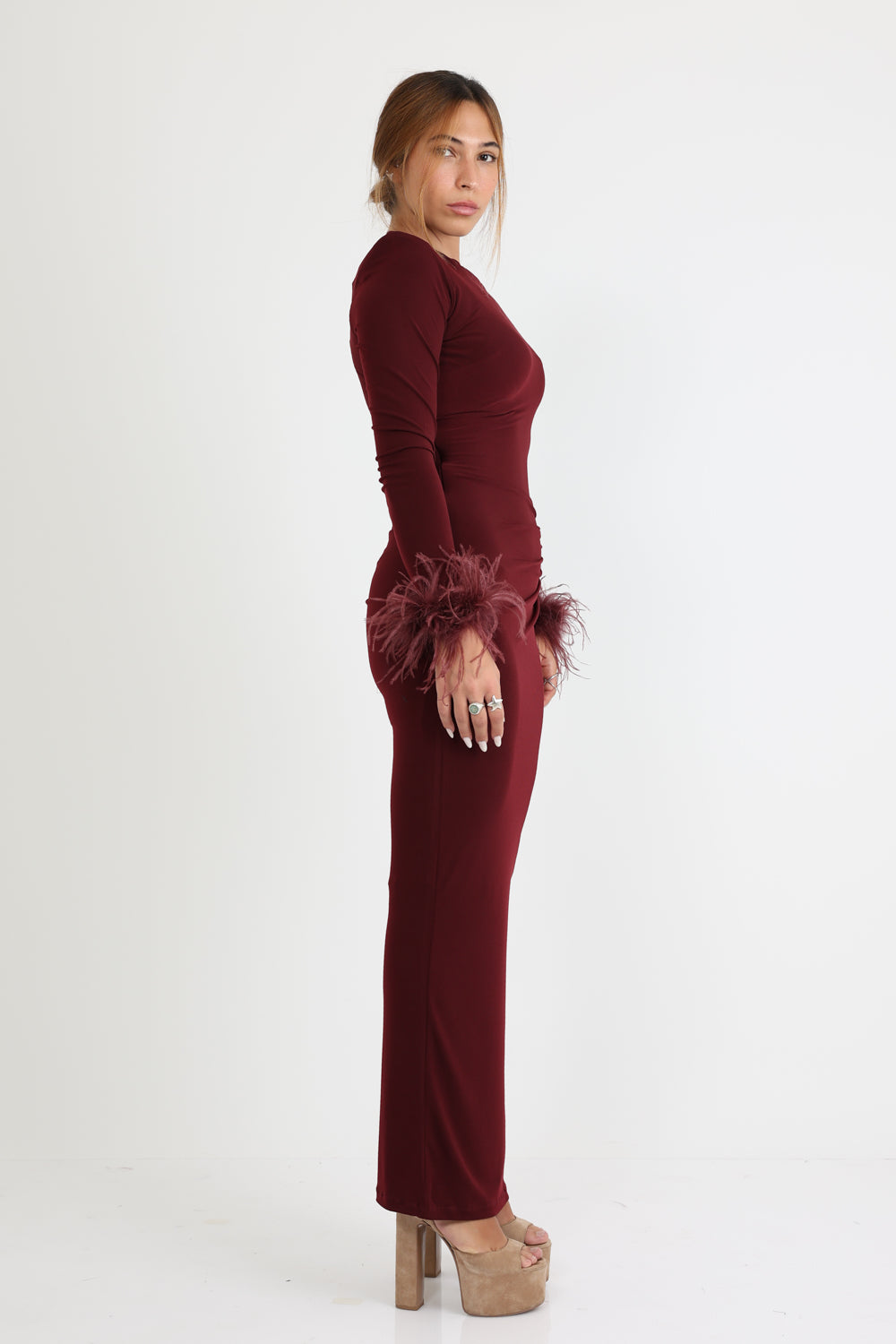 שמלה ארוכה עם כיווצים במותן בצירוף אבזם , בשרוולים סיומת של נוצות