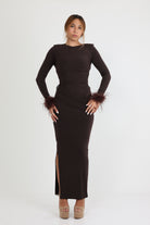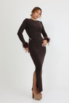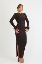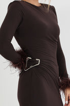 שמלה ארוכה עם כיווצים במותן בצירוף אבזם , בשרוולים סיומת של נוצות