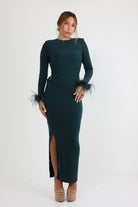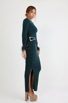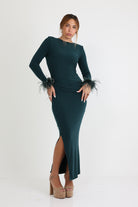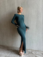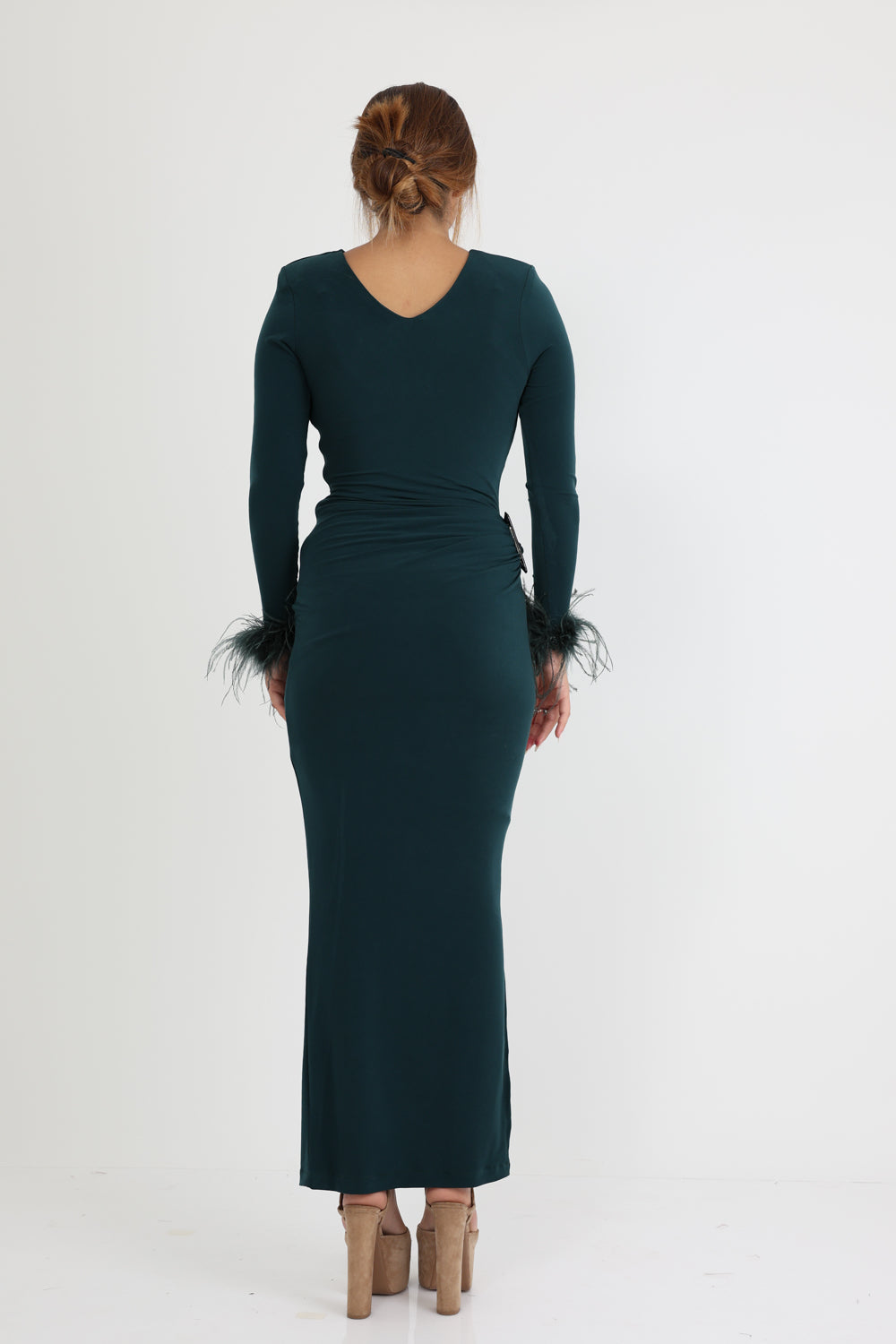 שמלה ארוכה עם כיווצים במותן בצירוף אבזם , בשרוולים סיומת של נוצות