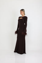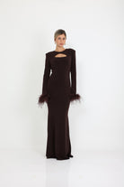 שמלה מקסי אלגנטית פתח קטן בצורת אליפסה מעל החזה וביידיים נוצות