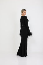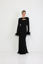 שמלה מקסי אלגנטית פתח קטן בצורת אליפסה מעל החזה וביידיים נוצות
