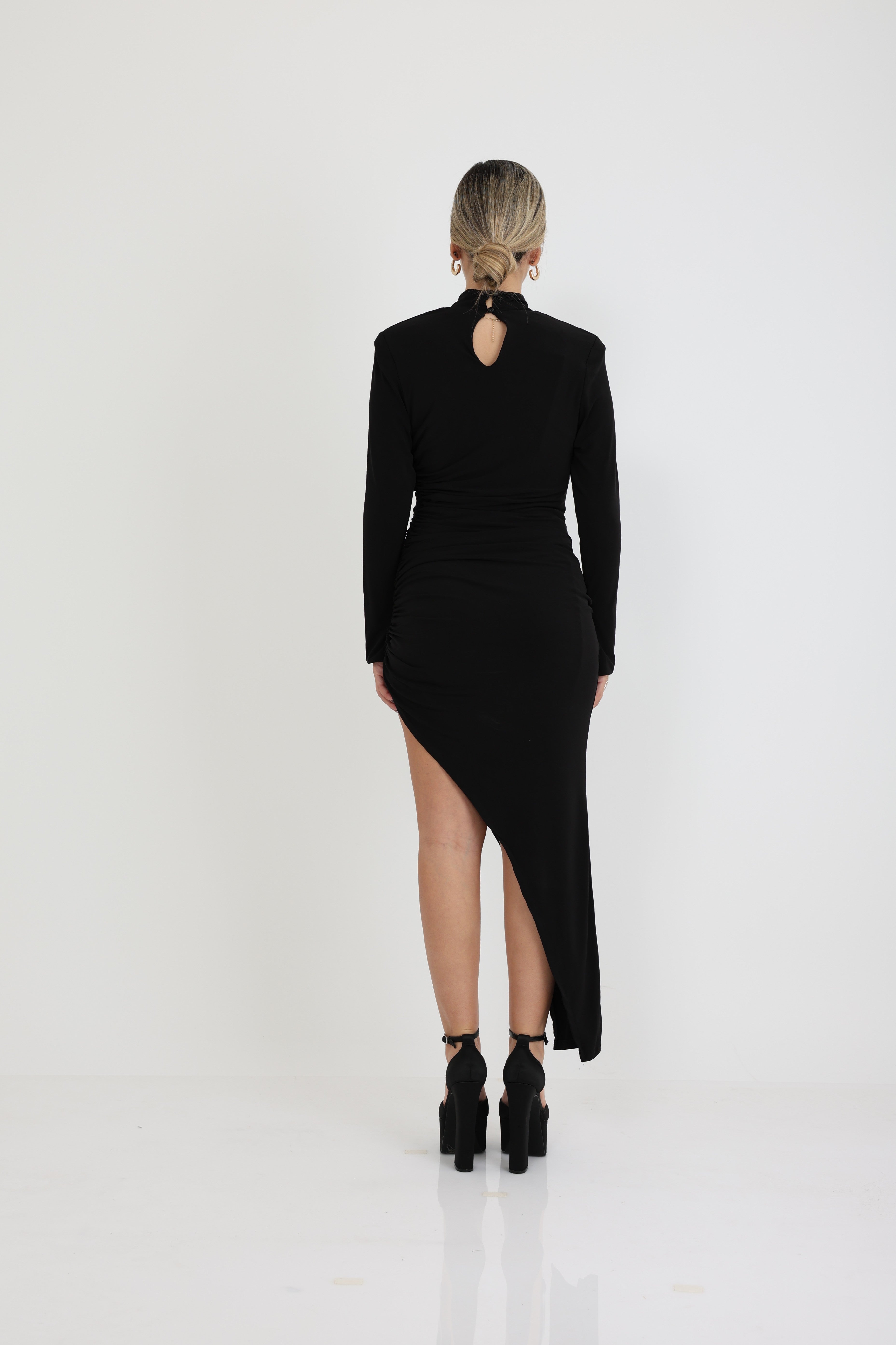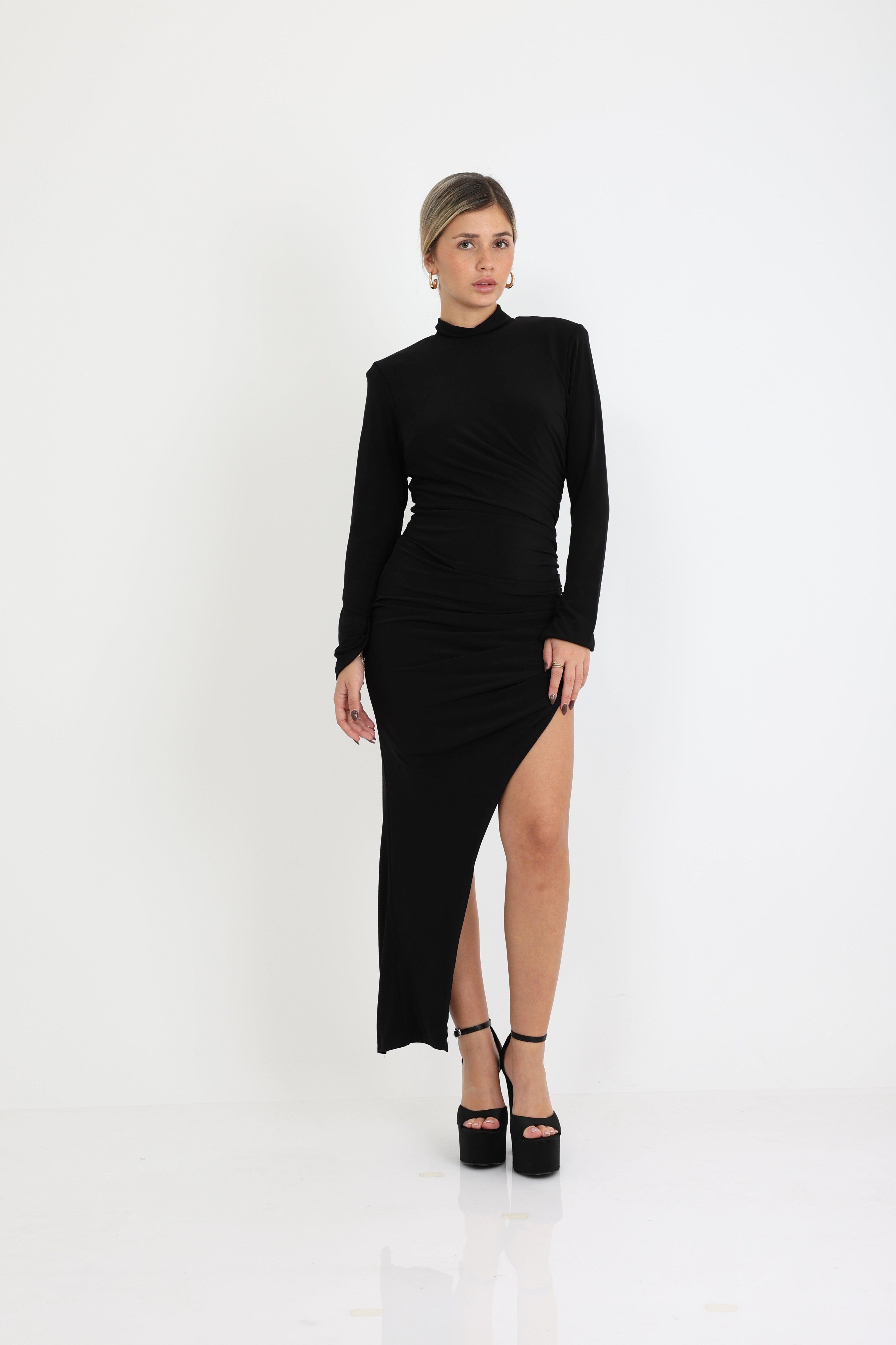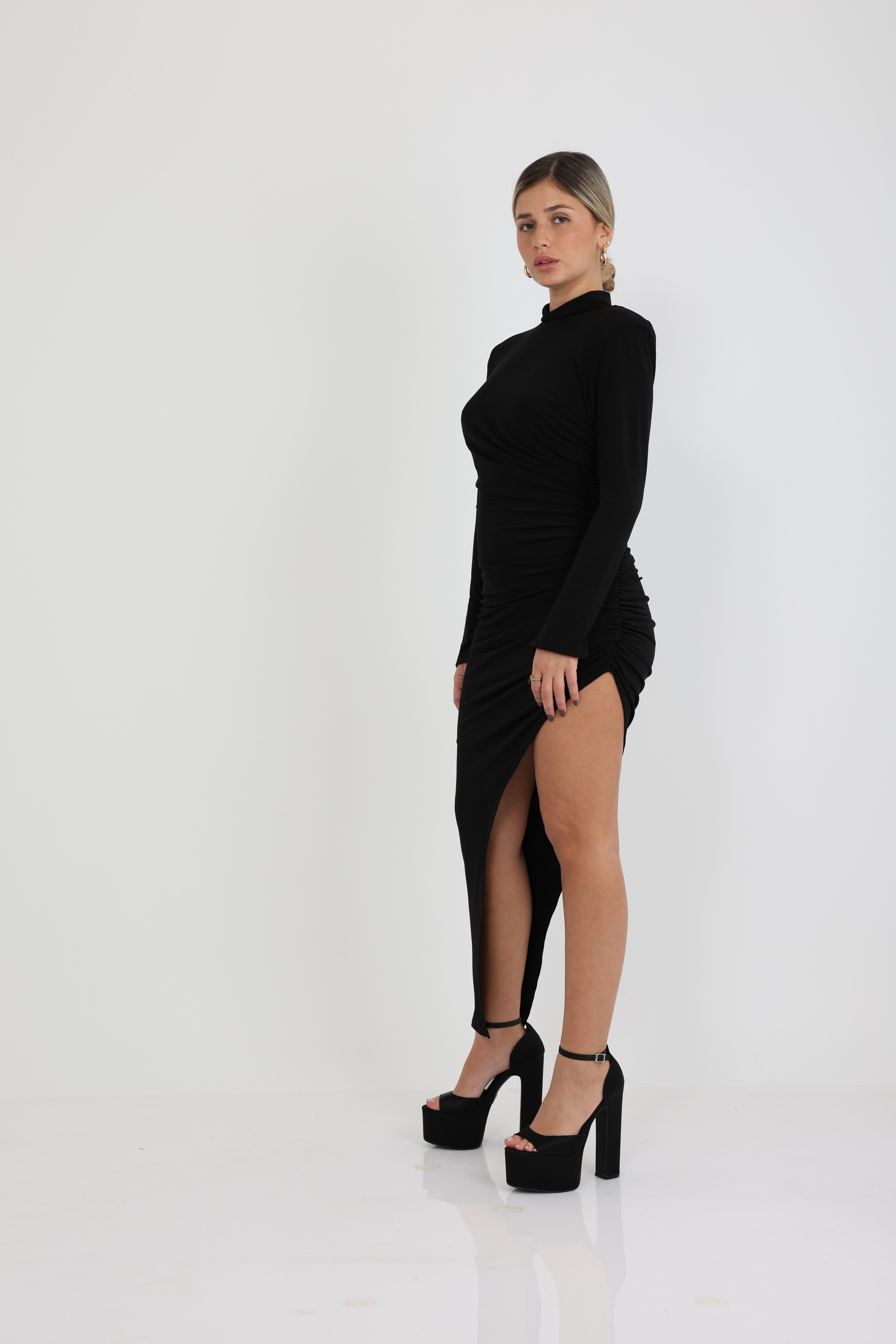 שמלה אלכסונית בעלת שסע עמוק שרוולים ארוכים