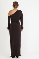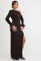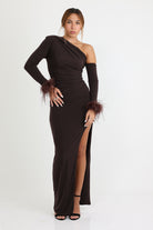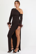 שמלה ערב בעלת גזרת כתף אחת עם שרוול אחד, שסע גבוהה ושרוולים מעוטרים בנוצות