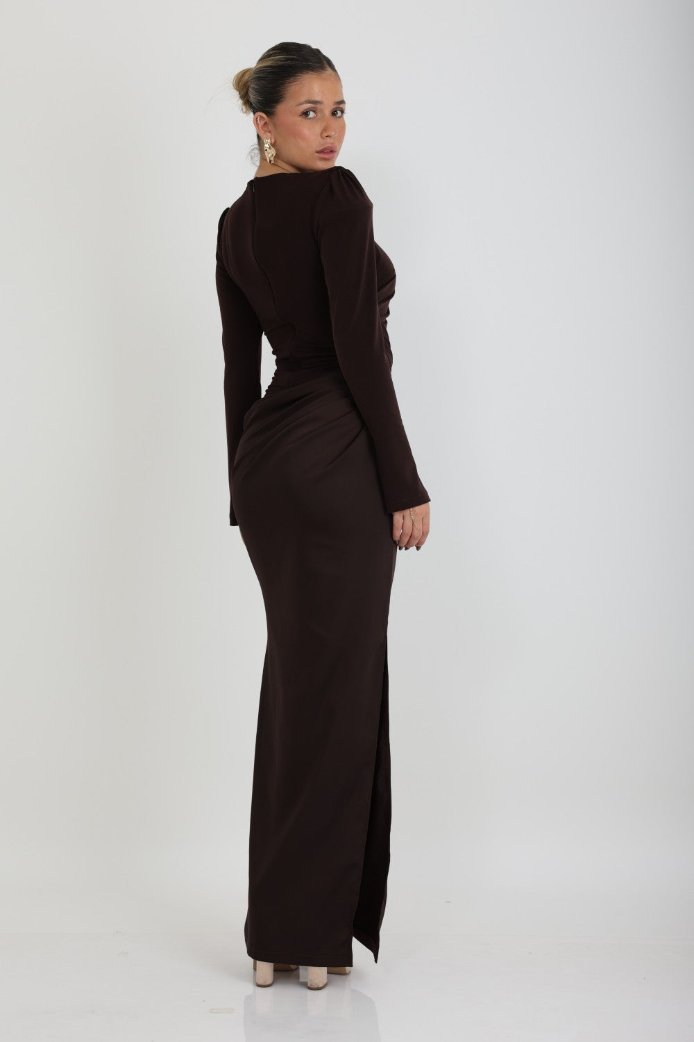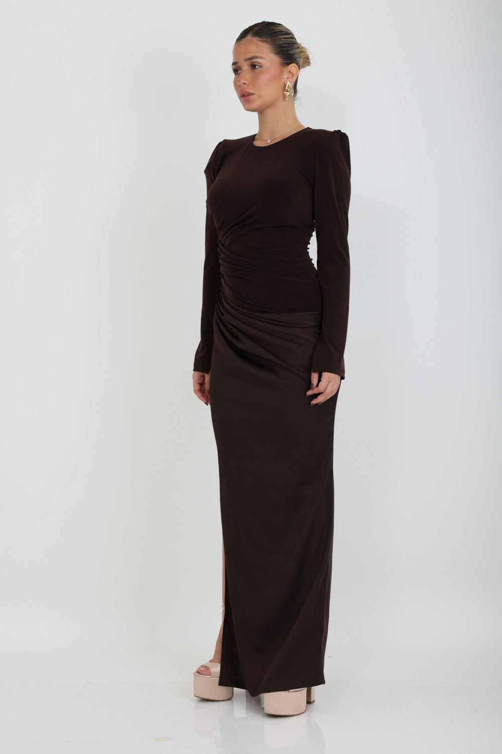 שמלה ארוכה קלאסית בעלת שילוב בדים עם כיווצים