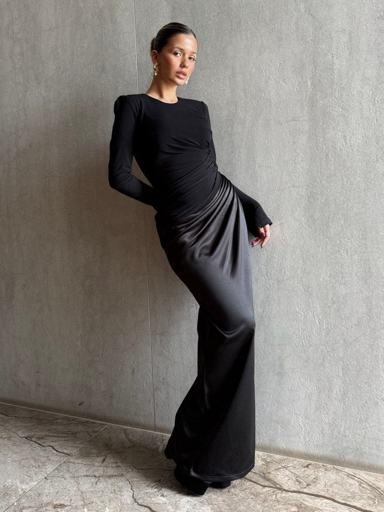 שמלה ארוכה קלאסית בעלת שילוב בדים עם כיווצים