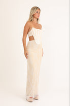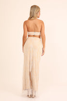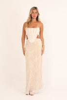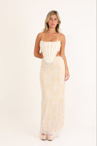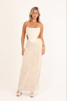 שמלה ערב ארוכה עם מחוך עצמות סטרפלס ותחרה עם חיתוכים