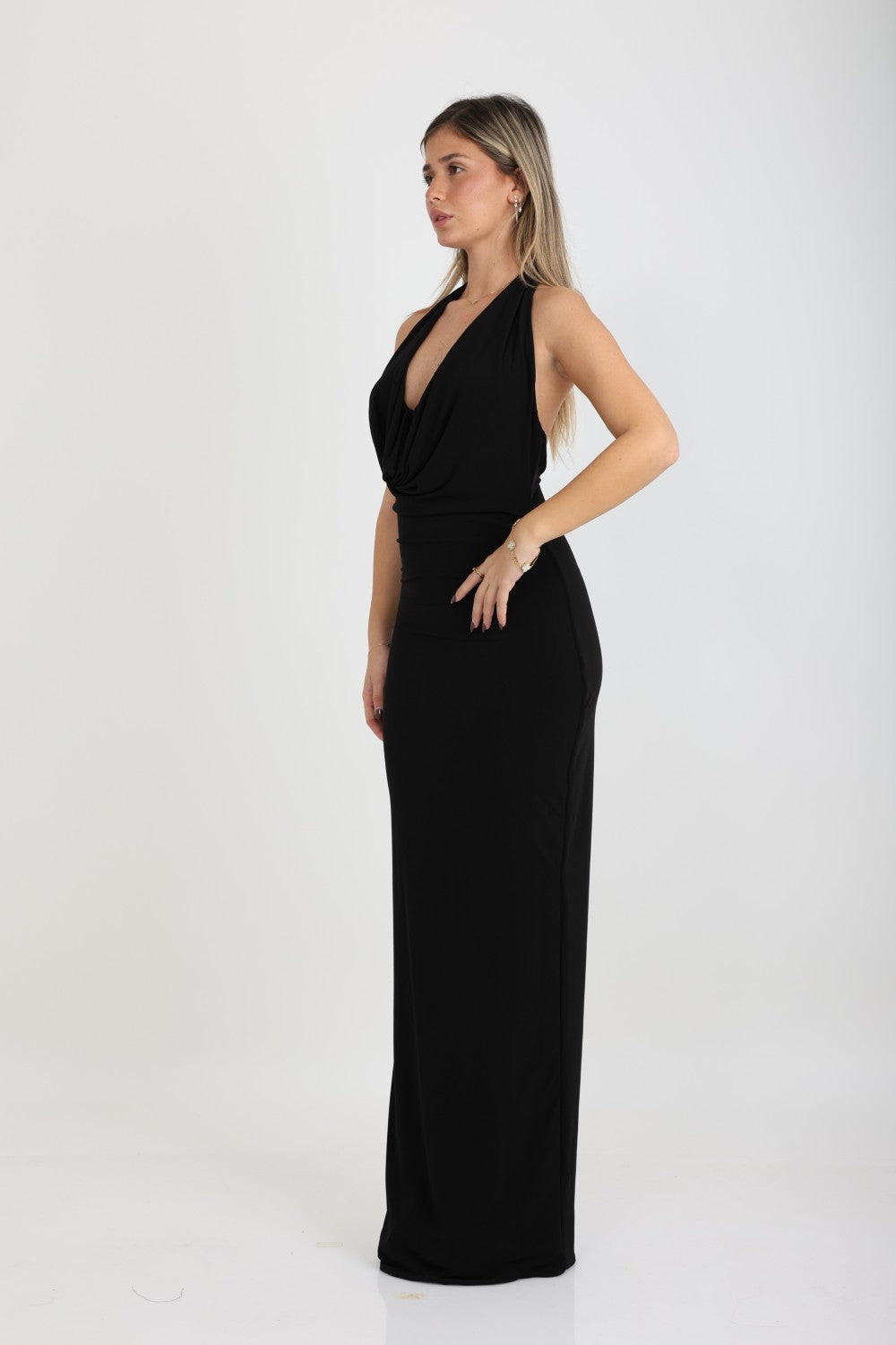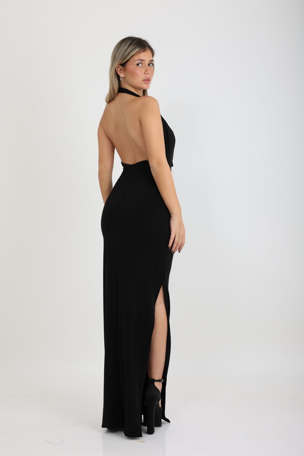 שמלה ערב אלגנטית בגזרת הולטר  עם מחשוף וי נשפך ומעוצב גב חשוף