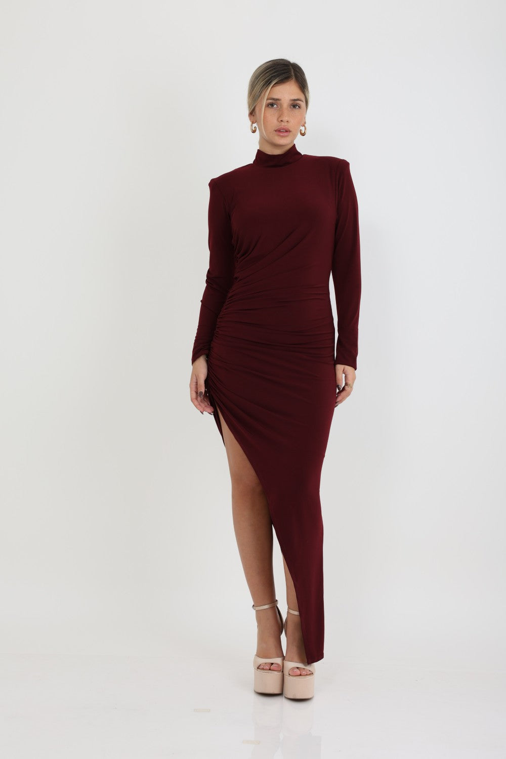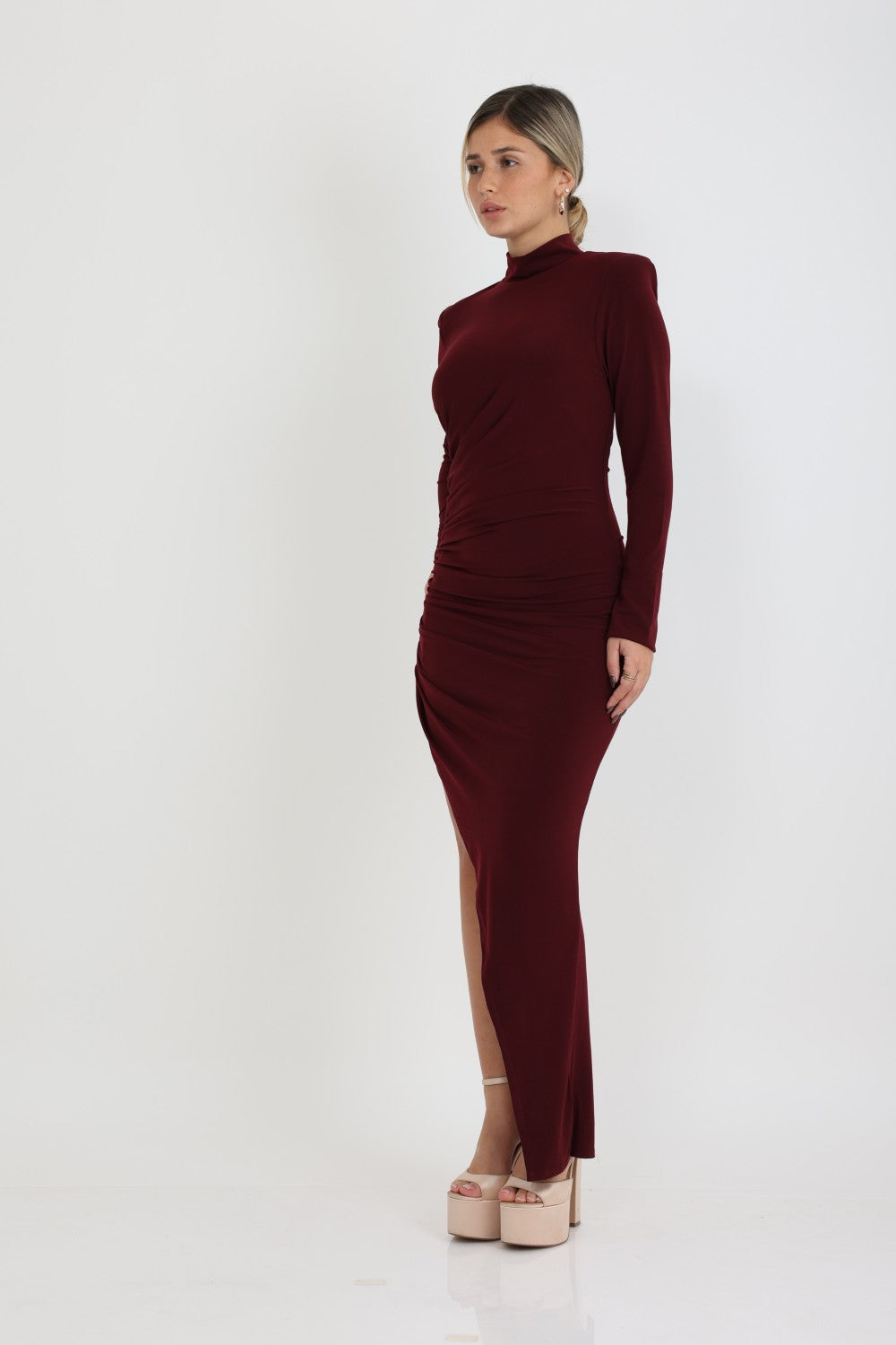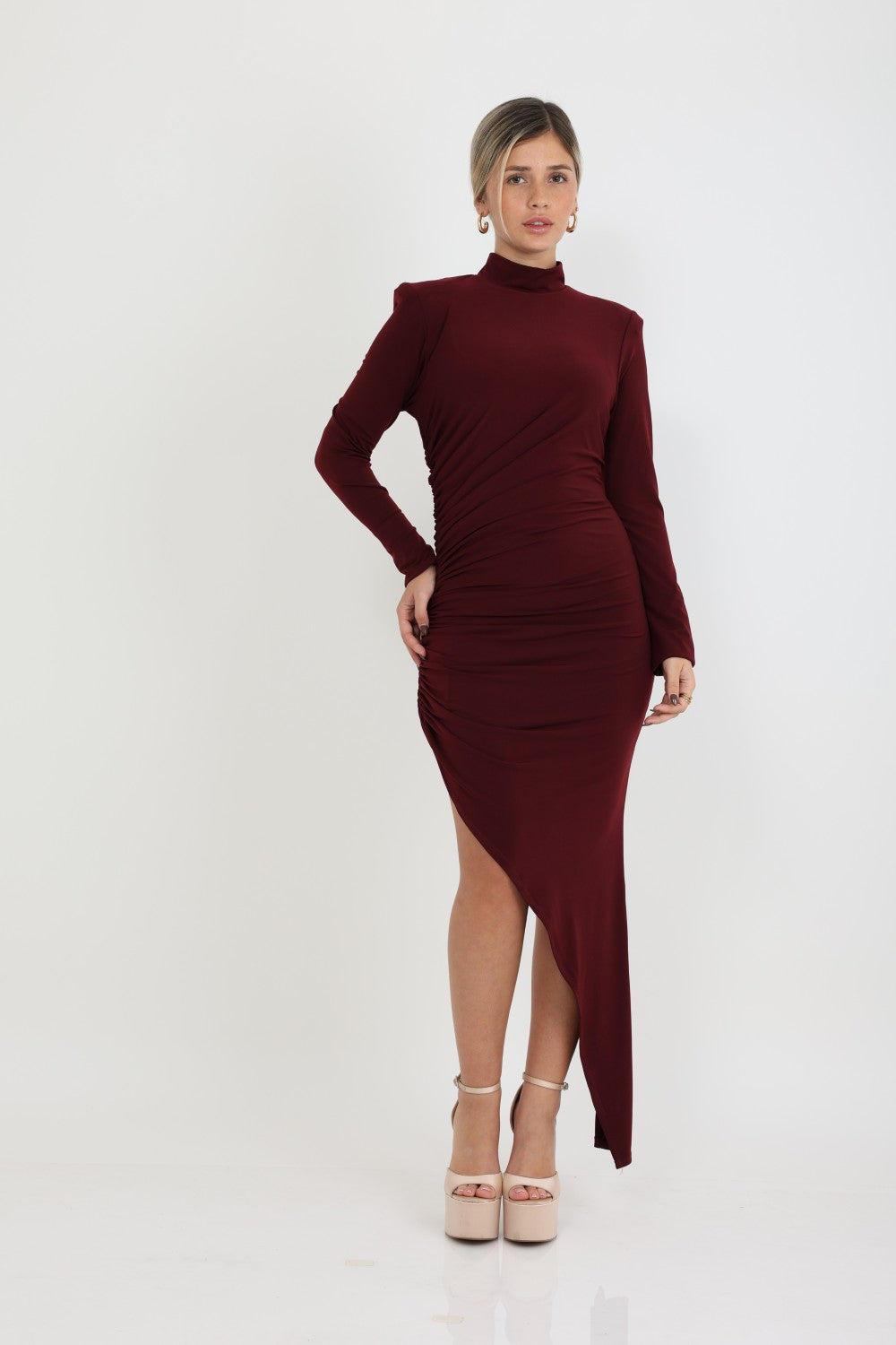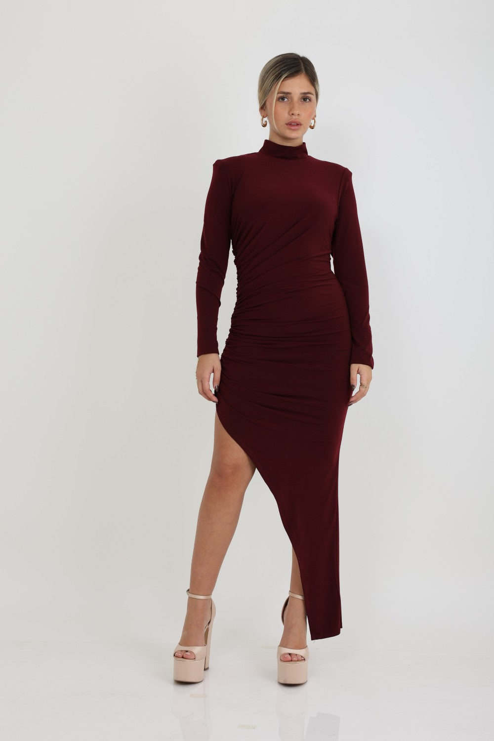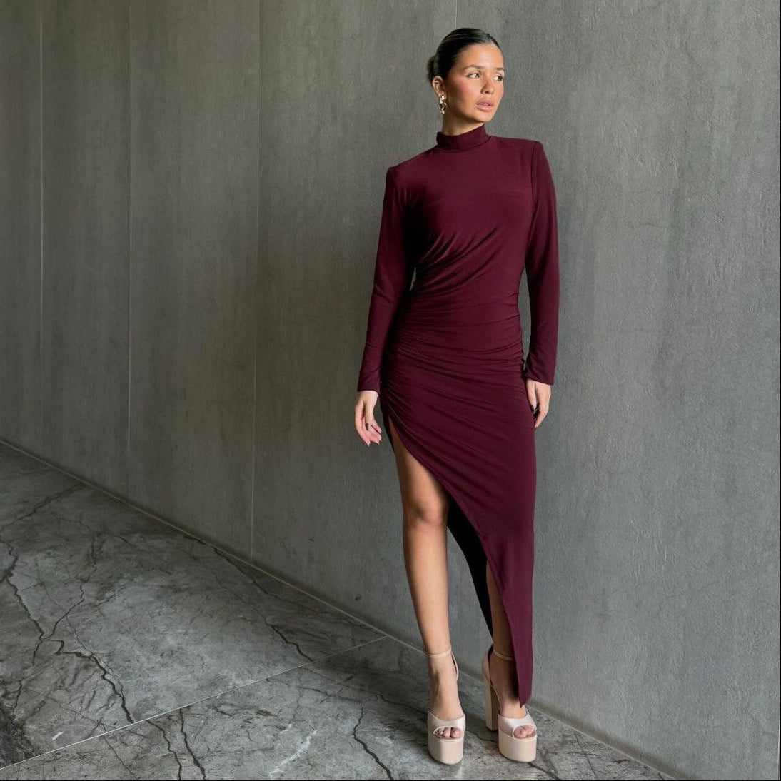 שמלה אלכסונית בעלת שסע עמוק שרוולים ארוכים
