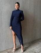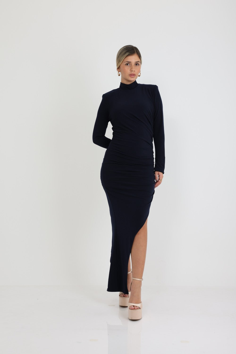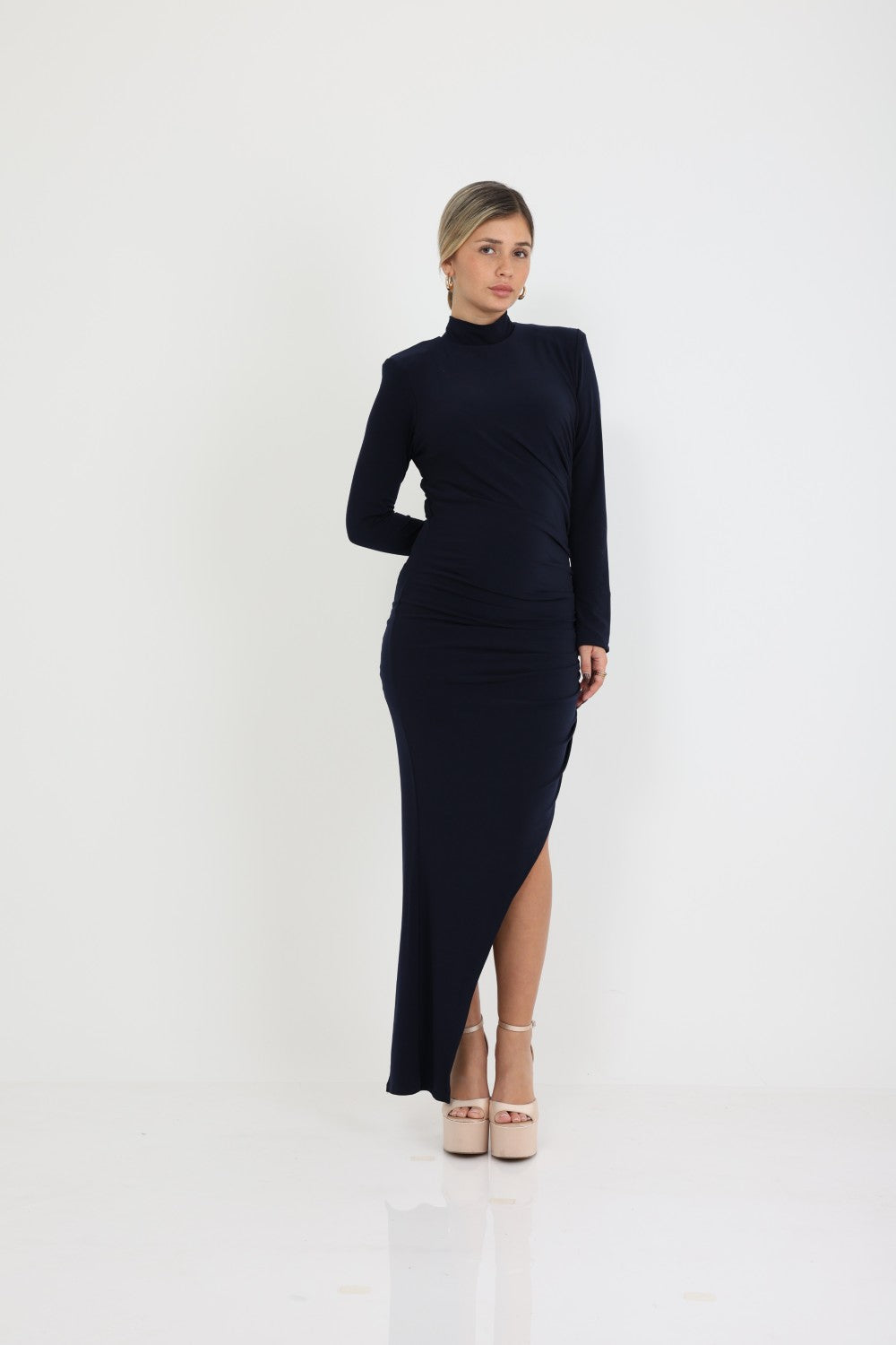שמלה אלכסונית בעלת שסע עמוק שרוולים ארוכים