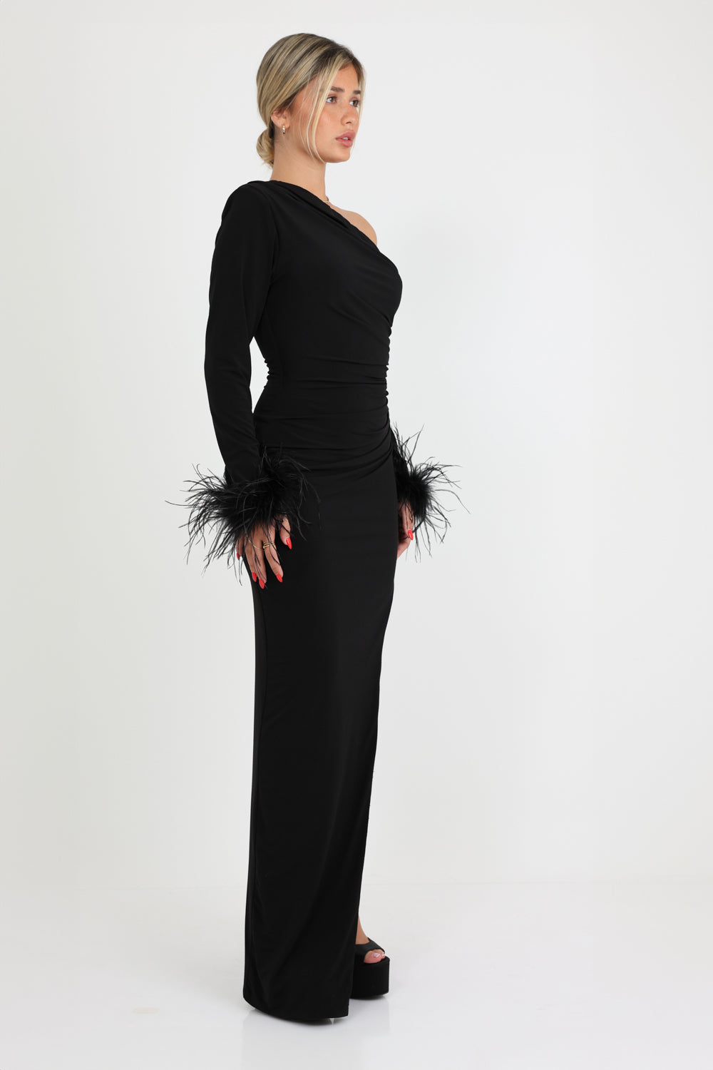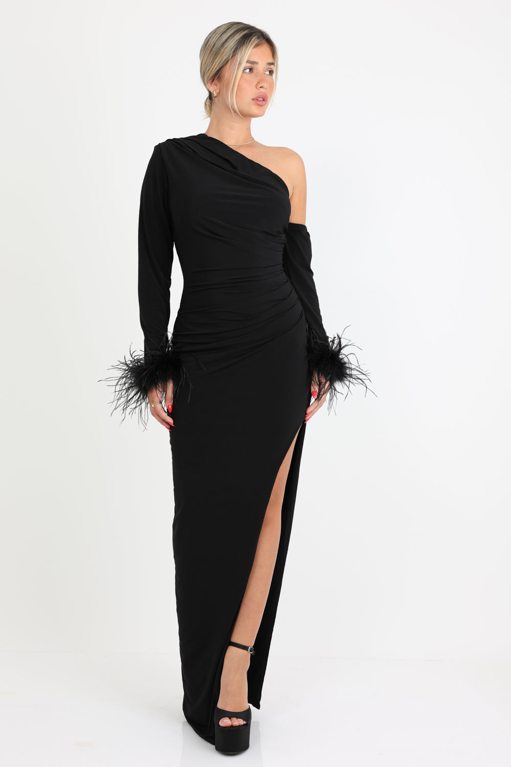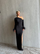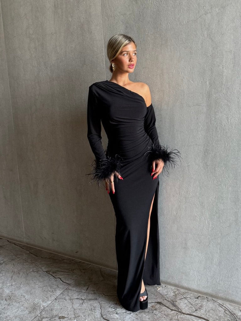שמלה ערב בעלת גזרת כתף אחת עם שרוול אחד, שסע גבוהה ושרוולים מעוטרים בנוצות