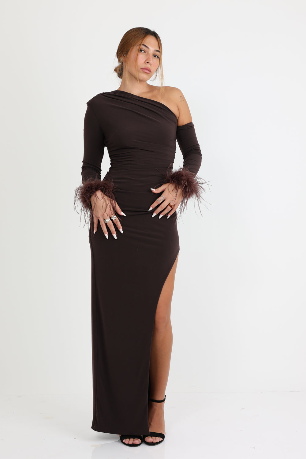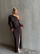 שמלה ערב בעלת גזרת כתף אחת עם שרוול אחד, שסע גבוהה ושרוולים מעוטרים בנוצות