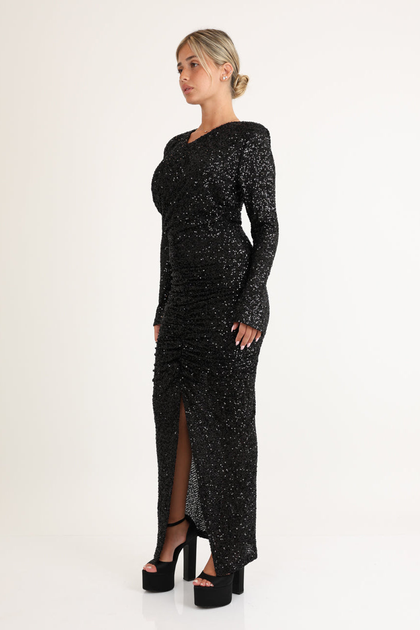 שמלה מקסי צמודה מנצנצת מעטפת בחזה ושסע קטן
