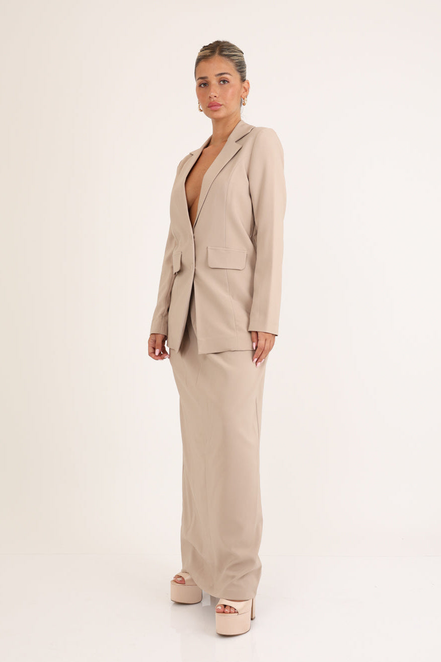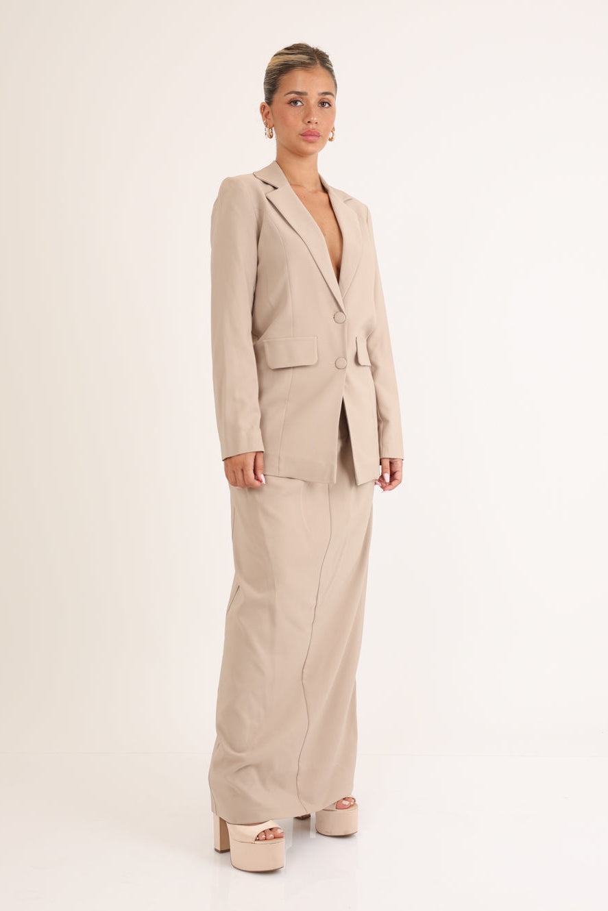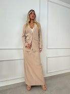 חליפת חצאית-מקסי לבנה ומחויטת במראה מודרני